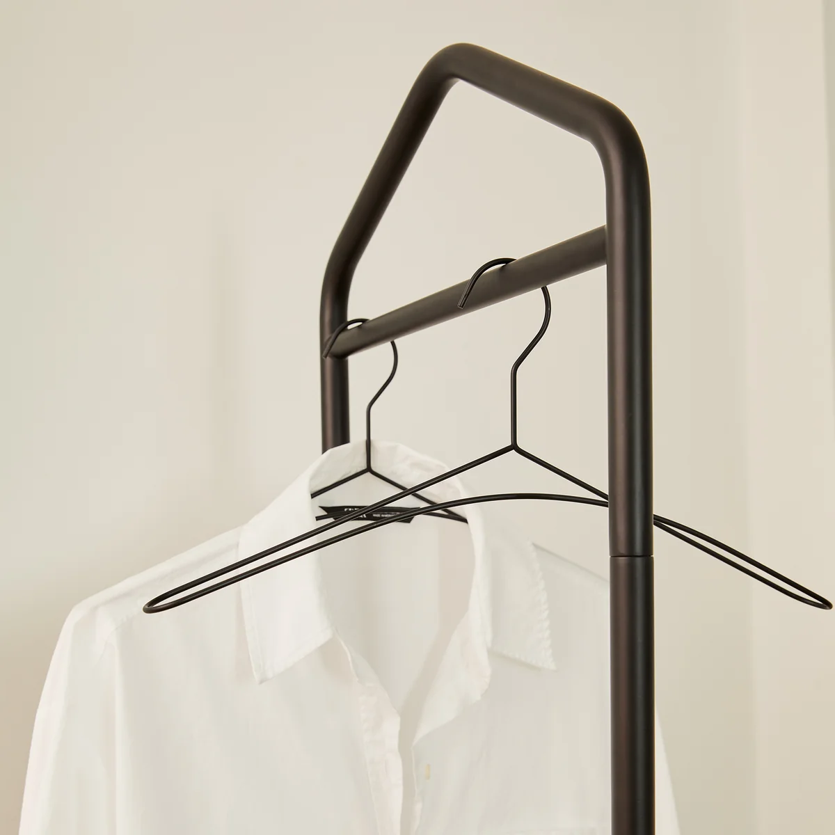 Outre les avantages pratiques, le design s'inspire d'un langage des formes clair et intemporel, de sorte que les cintres en fil métallique peuvent également être utilisés dans une garde-robe ouverte ou pour présenter des vêtements individuels dans le magasin.
