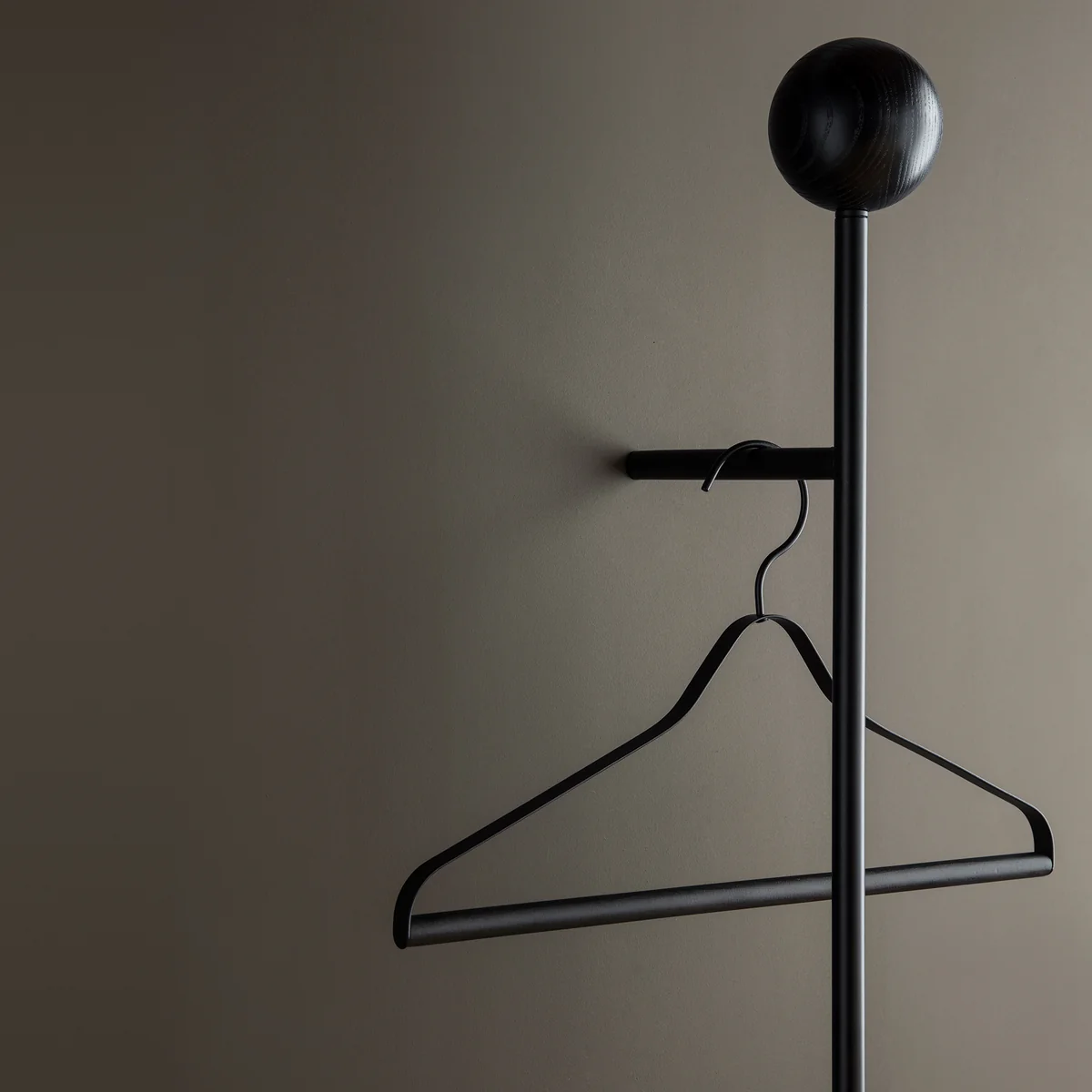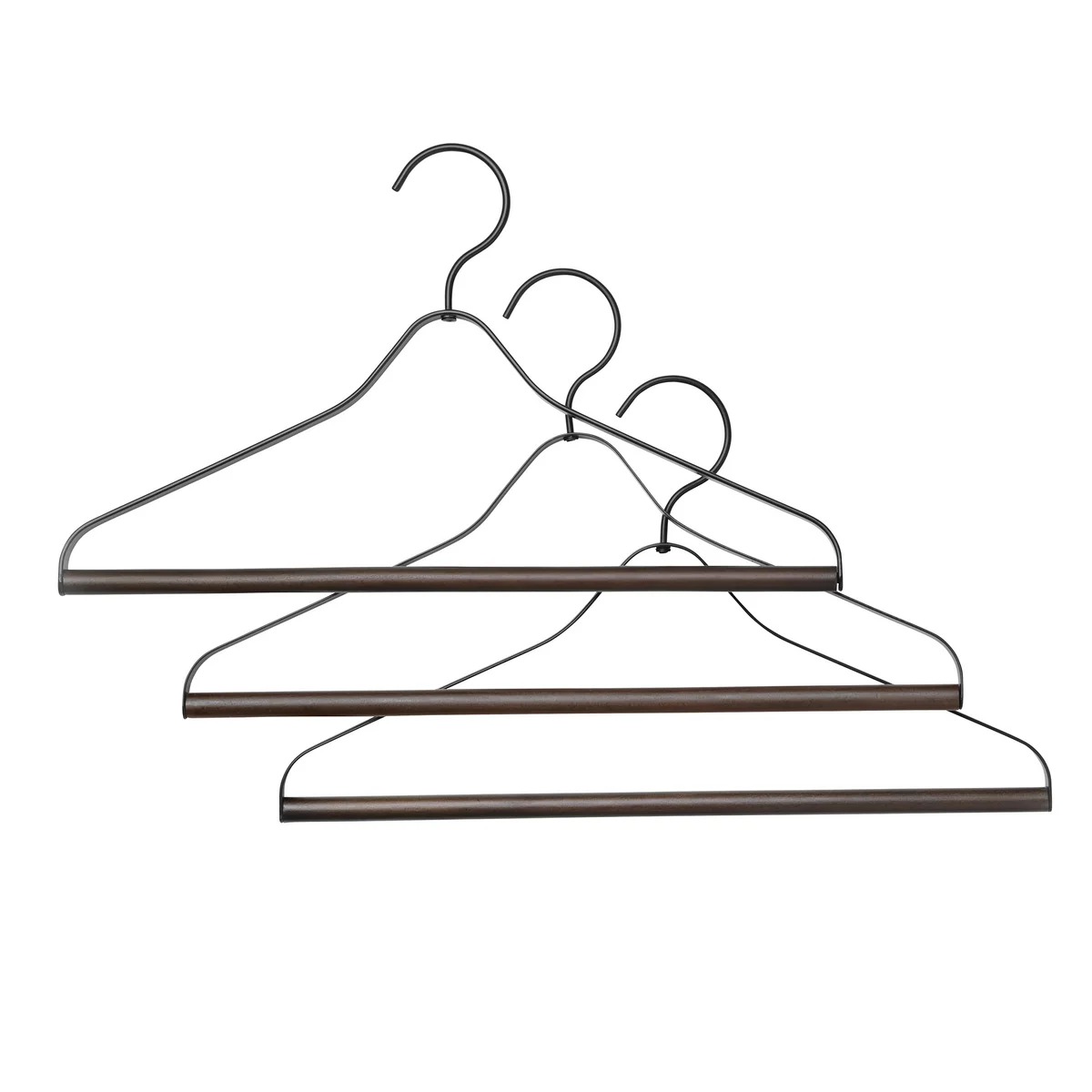 Les cintres de haute qualité de Ferm Living Living sont disponibles en set de 3 et se composent d'une combinaison d'acier peint par poudrage et de bois teinté noir. Les matériaux donnent aux cintres un aspect à la fois robuste, durable, discret et moderne, ce qui leur permet d'être utilisés de manière flexible. La barre transversale et le crochet rotatif pour suspendre les cintres sont également particulièrement pratiques.