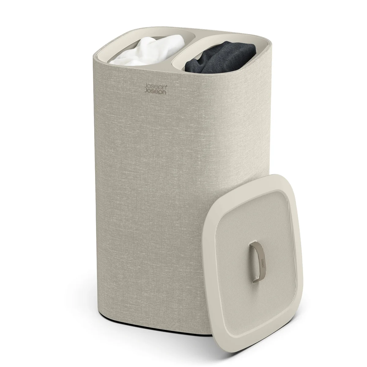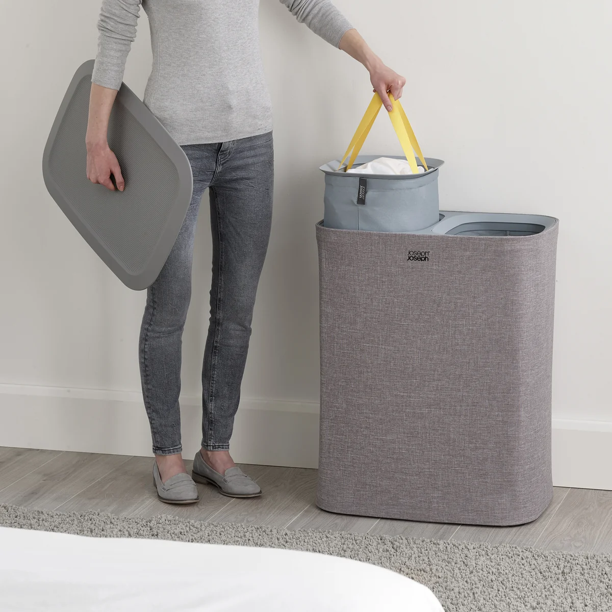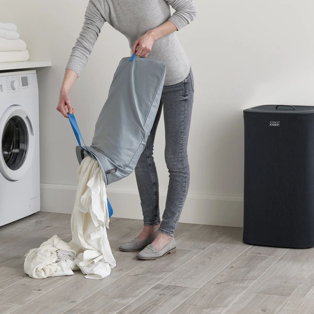 Le panier à linge Tota de Joseph Joseph dispose d'une multitude de fonctions pratiques qui facilitent le travail le jour de la lessive : Le bac contient deux sacs en tissu qui permettent de séparer le linge en couleurs claires et foncées.