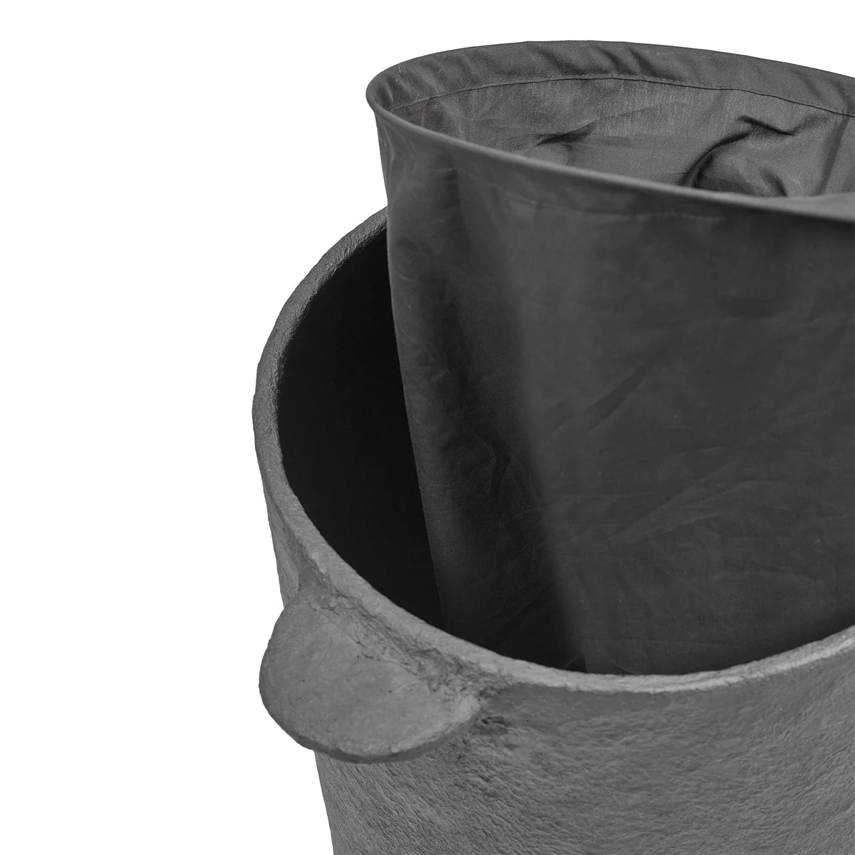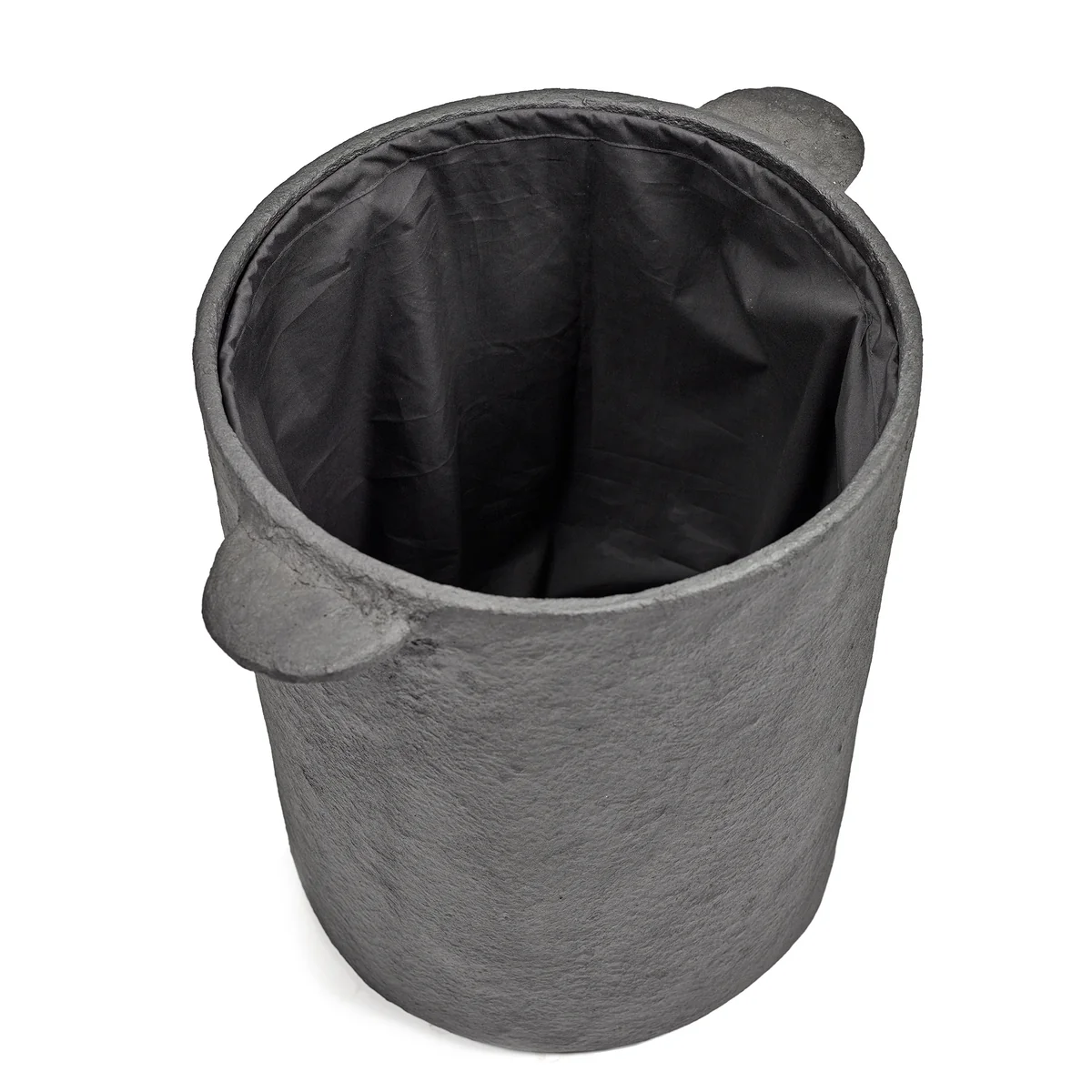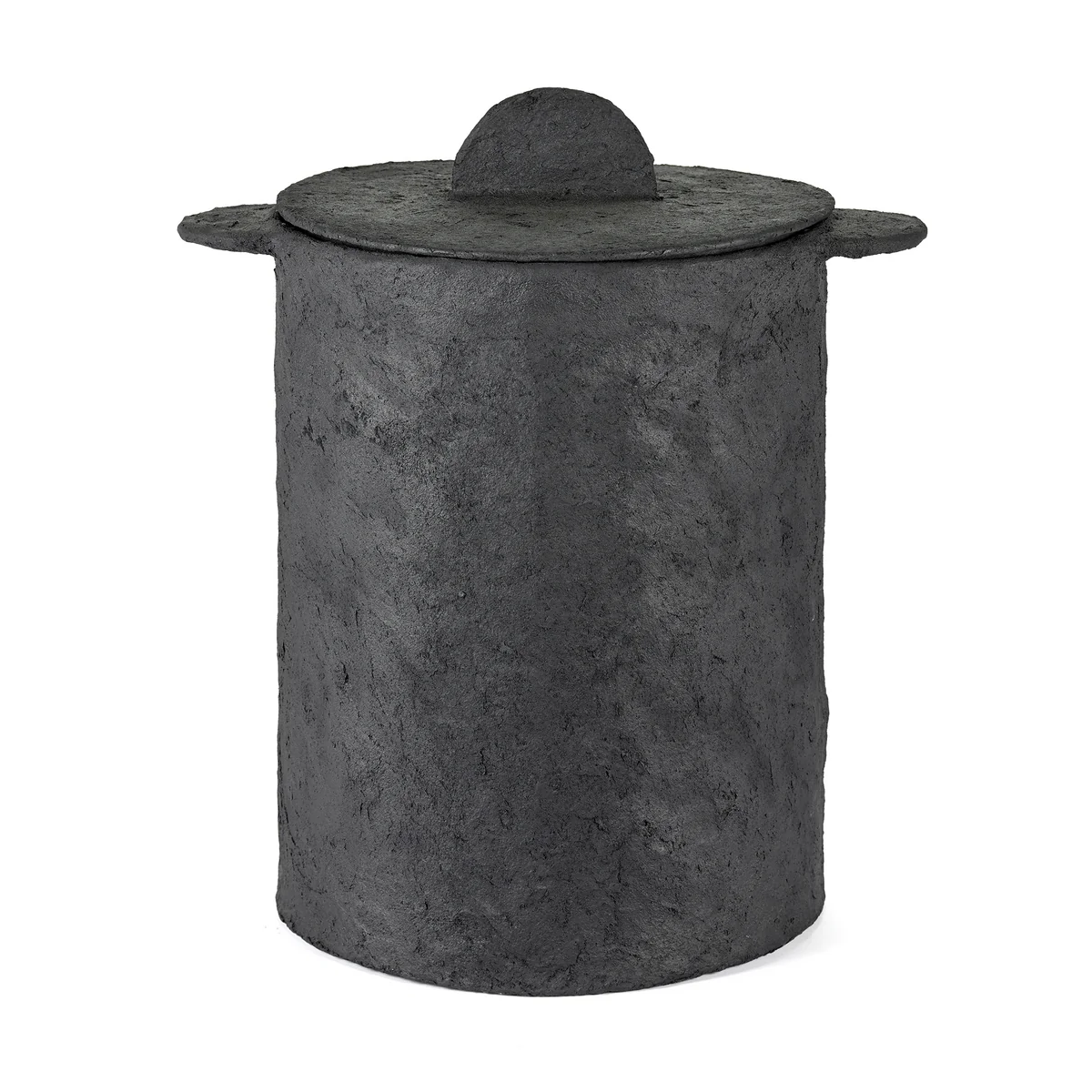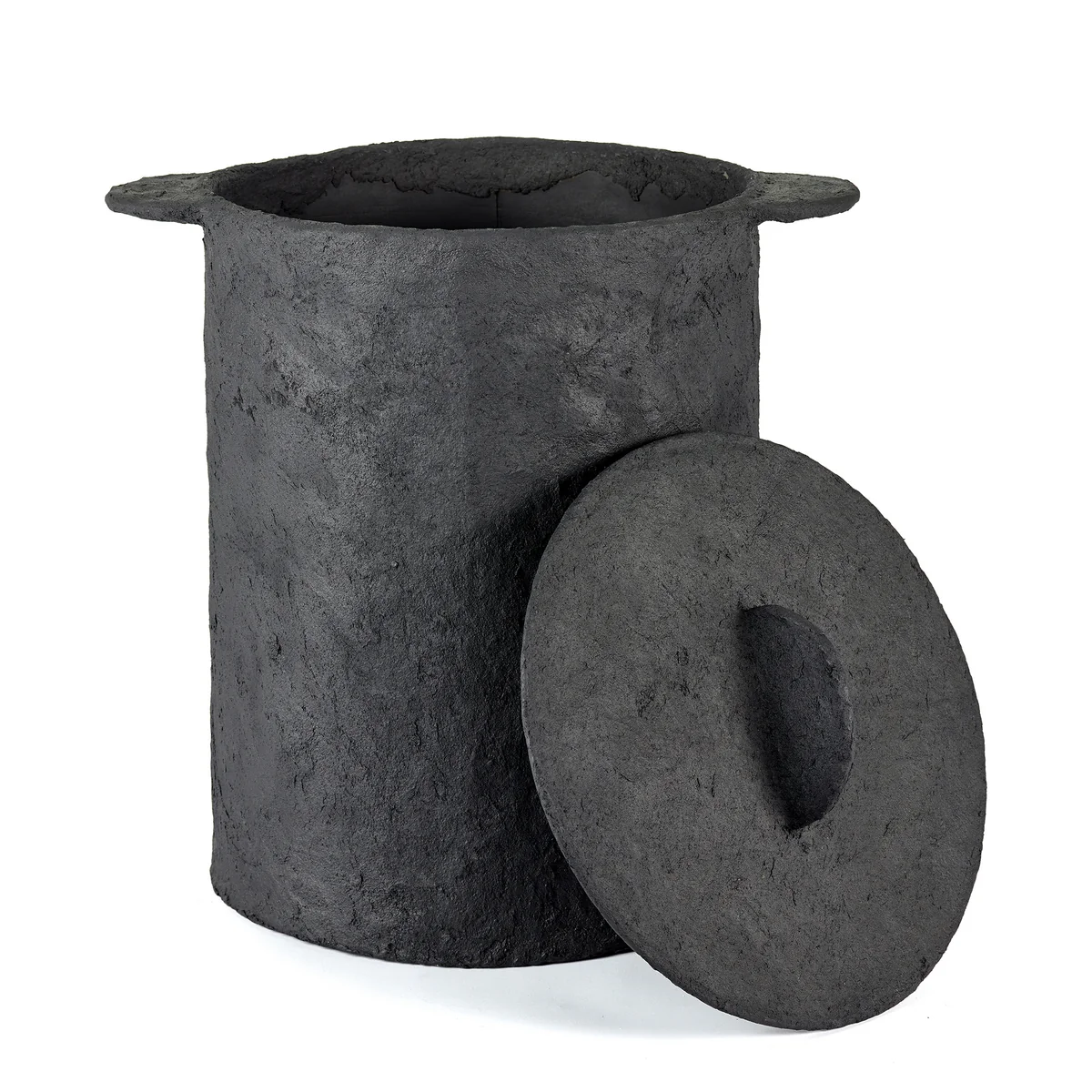 Fabriqué en papier mâché selon un procédé complexe de couches successives, le panier séduit par sa structure expressive et sa forme organique. La couleur noire profonde souligne l'aspect sculptural et confère à l'objet une présence calme, presque monumentale. Un sac en lin amovible à l'intérieur assure un confort pratique, tandis que le couvercle assorti dissimule discrètement le contenu - idéal pour un habitat stylé avec l'amour du détail.