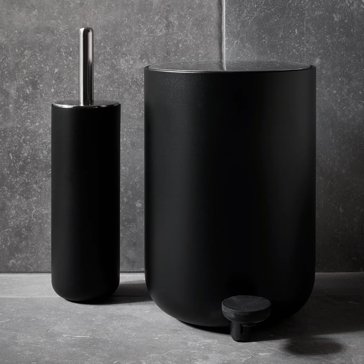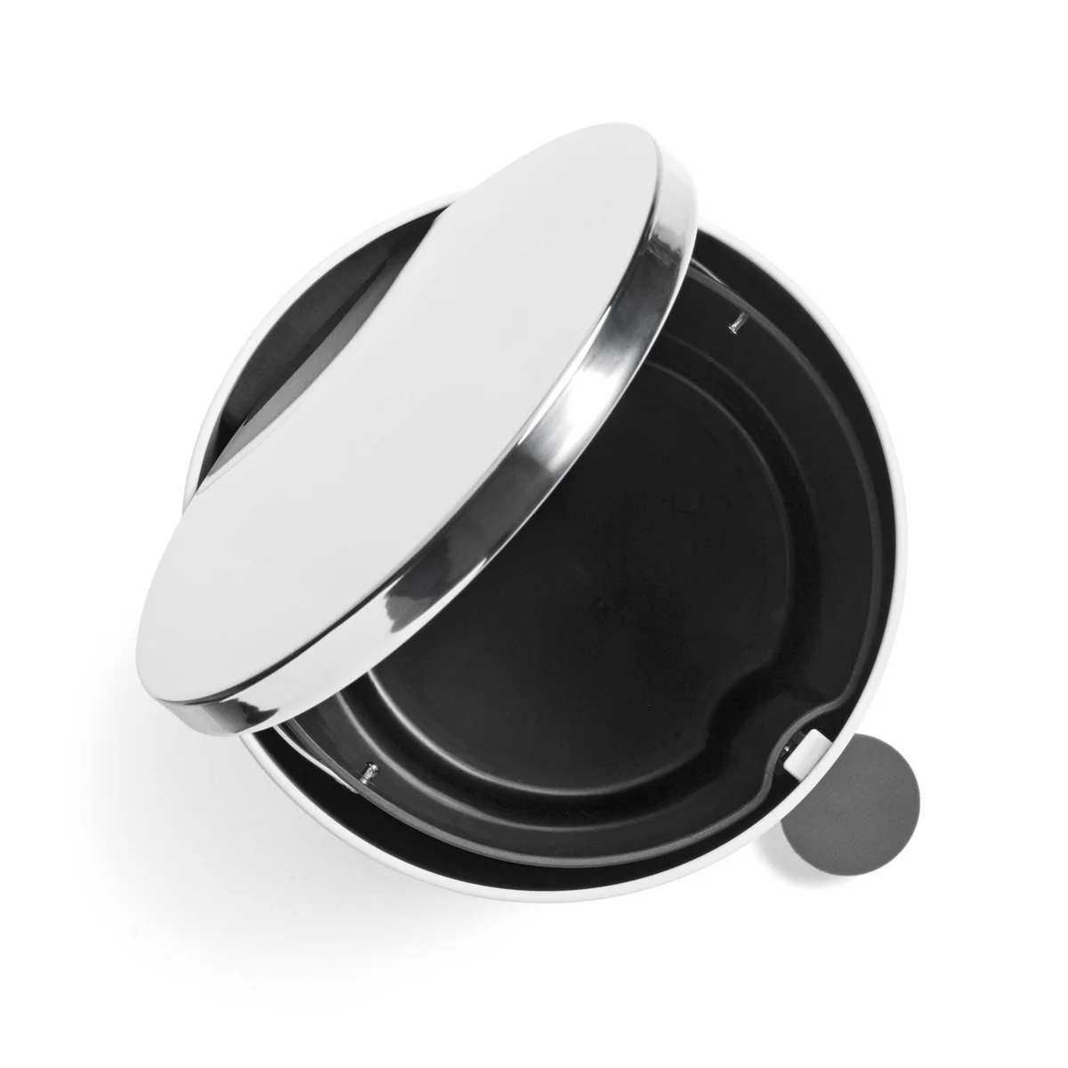 L'enveloppe extérieure de la poubelle à pédale est en acier laqué blanc ou noir et assure une présentation élégante qui s'intègre dans presque toutes les ambiances de salle de bains. Le couvercle à fermeture silencieuse présente une élégante surface en acier inoxydable brossé et reste à l'intérieur de la poubelle lorsqu'on l'ouvre, ce qui réduit l'espace nécessaire et permet de placer la poubelle dans les coins. Un anneau en caoutchouc au fond assure une stabilité sûre et antidérapante.