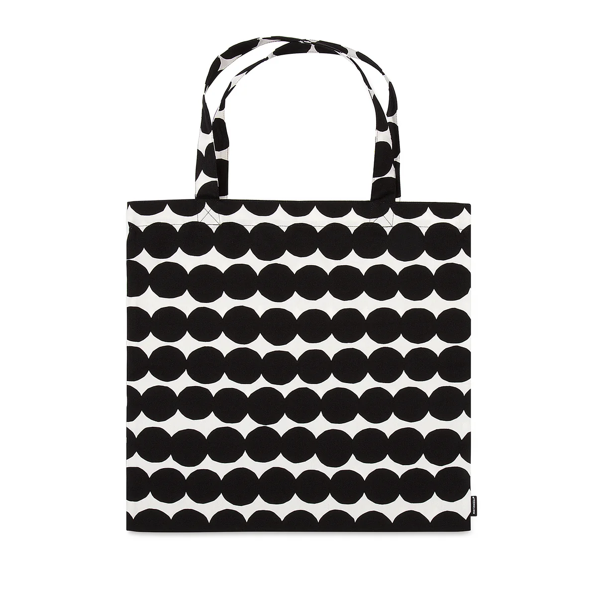 Le sac Räsymatto de Marimekko est décoré du motif à pois distinctif conçu par Maija Louekari. Le charmant motif noir et blanc saura adoucir chaque achat et attirera tous les regards.