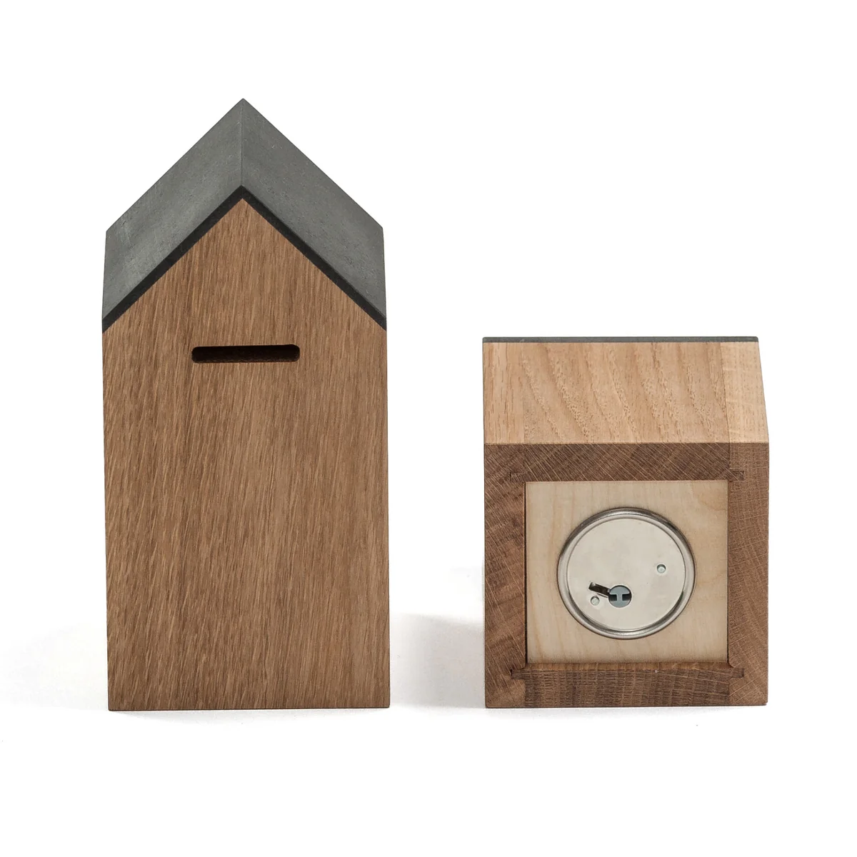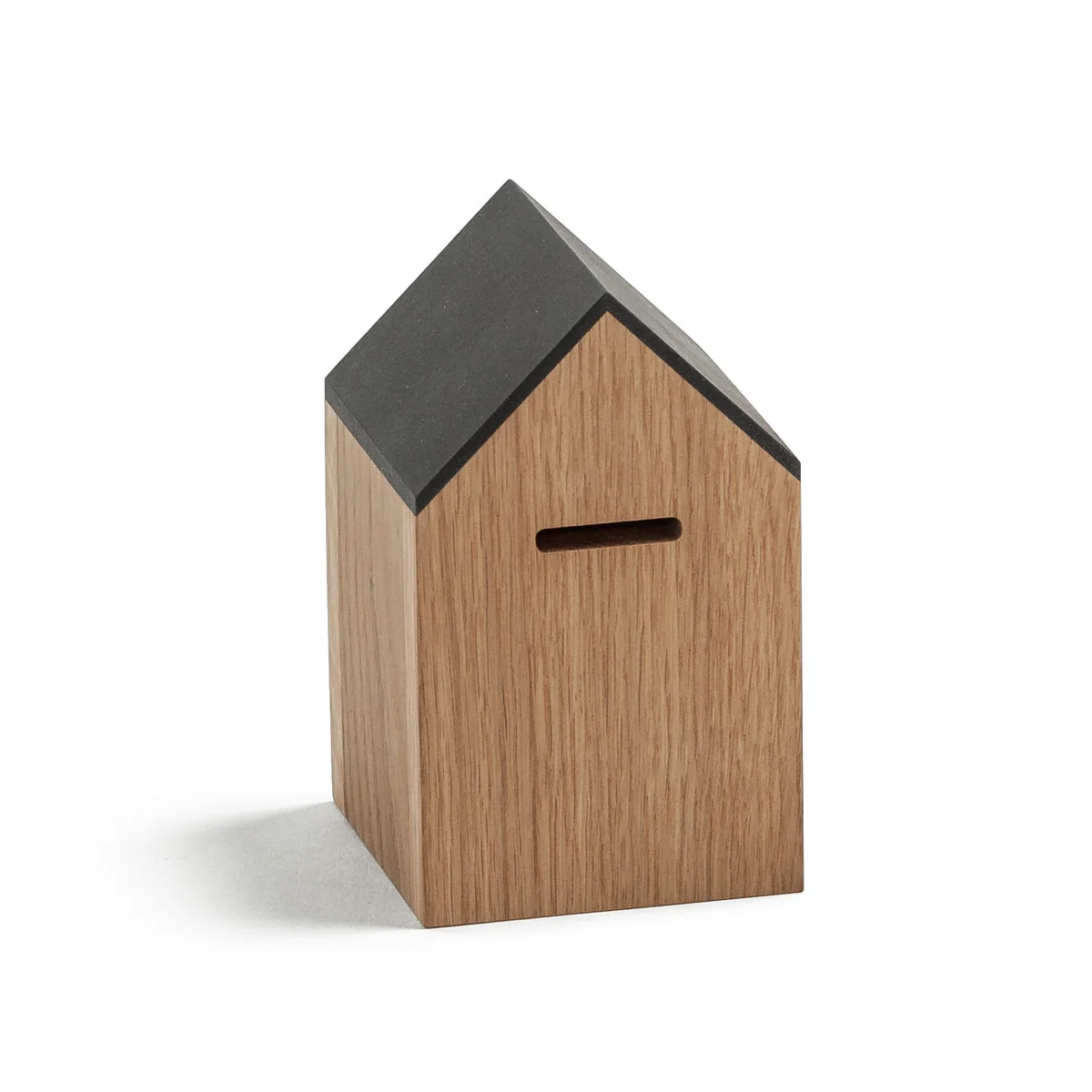 Fabriquée en bois de chêne massif huilé, la tirelire séduit par ses lignes claires, sa forme intemporelle et son toucher agréable. La fente d'insertion est discrètement intégrée au bord du toit et le fond est doté d'une serrure pratique avec clé, afin que les économies soient conservées en toute sécurité - et restent accessibles à tout moment.