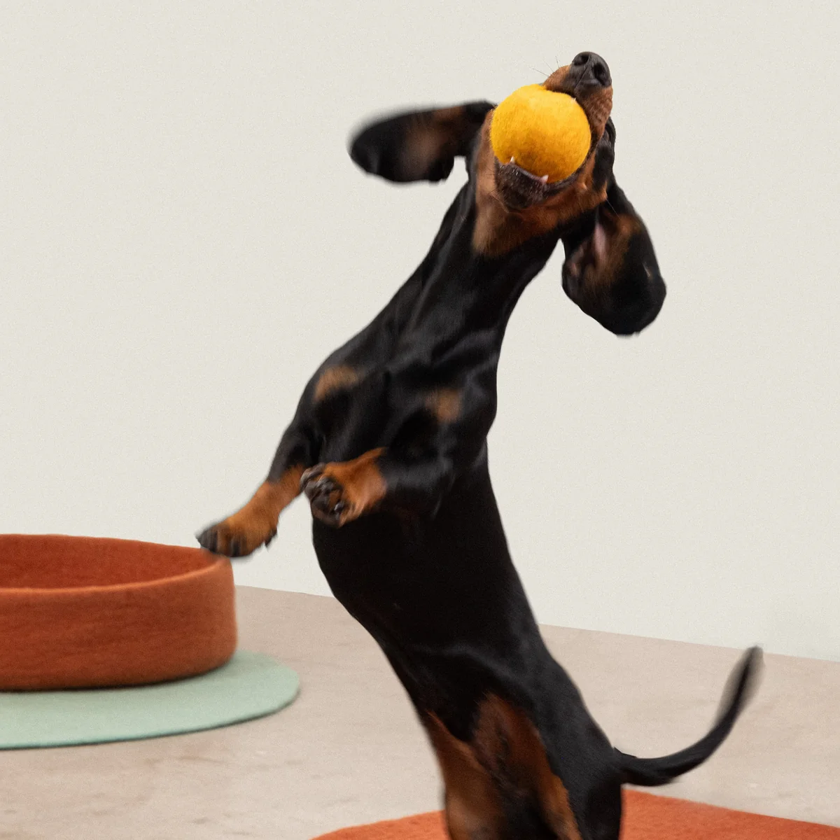 Les jouets pour chiens Risa & Kuno de myfelt sont fabriqués en pure laine vierge et sont donc exempts de substances nocives, antisalissure et antibactériens. Les balles de feutre sont des jouets pour chiens esthétiques et durables, idéaux pour gambader, même sur des sols sensibles ou bruyants. De plus, elles contribuent à la santé dentaire du chien.