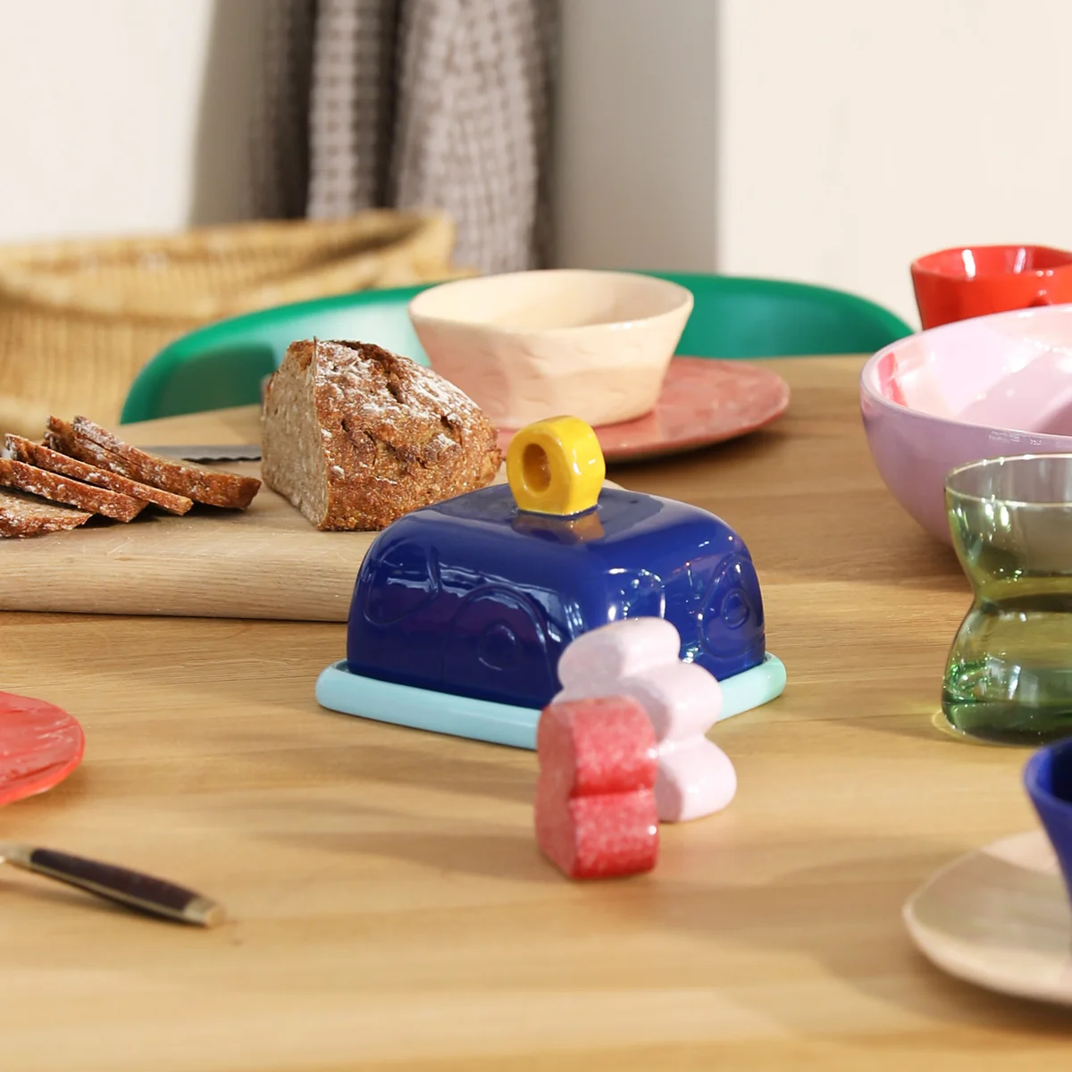 Ce remarquable beurrier apporte une touche créative à la table avec ses couleurs contrastées et ses formes abstraites. Il garde le beurre frais au frais et sert en même temps d'élément décoratif pour chaque décoration de table. Parfait pour l'usage quotidien ou les occasions spéciales - une combinaison élégante de fonctionnalité et de design moderne.