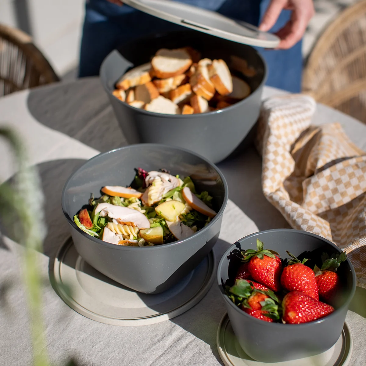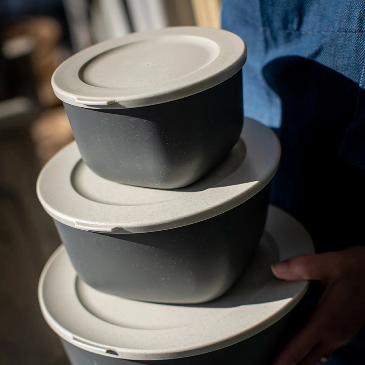 Koziol fabrique la Connect Boîte de conservation en thermoplastique avec cellulose. La boîte de conservation est ainsi écologique, durable, réutilisable, adaptée aux aliments, recyclable et garantie sans formaldéhyde ni BPA. Tous les bols sont empilables les uns dans les autres et prennent ainsi un minimum de place dans l'armoire.