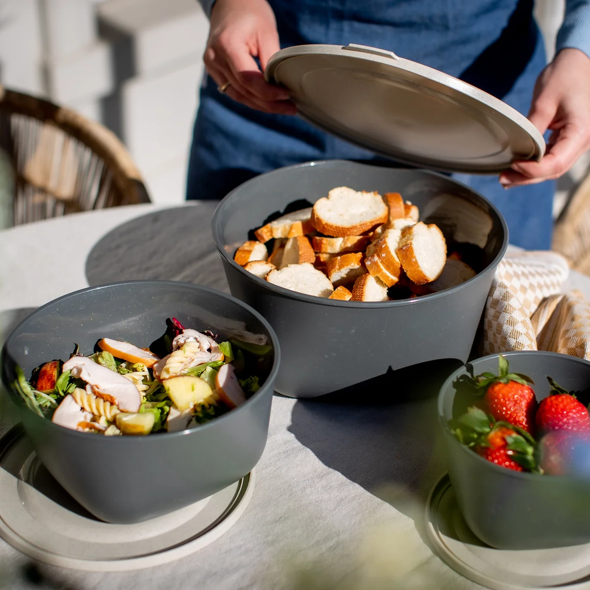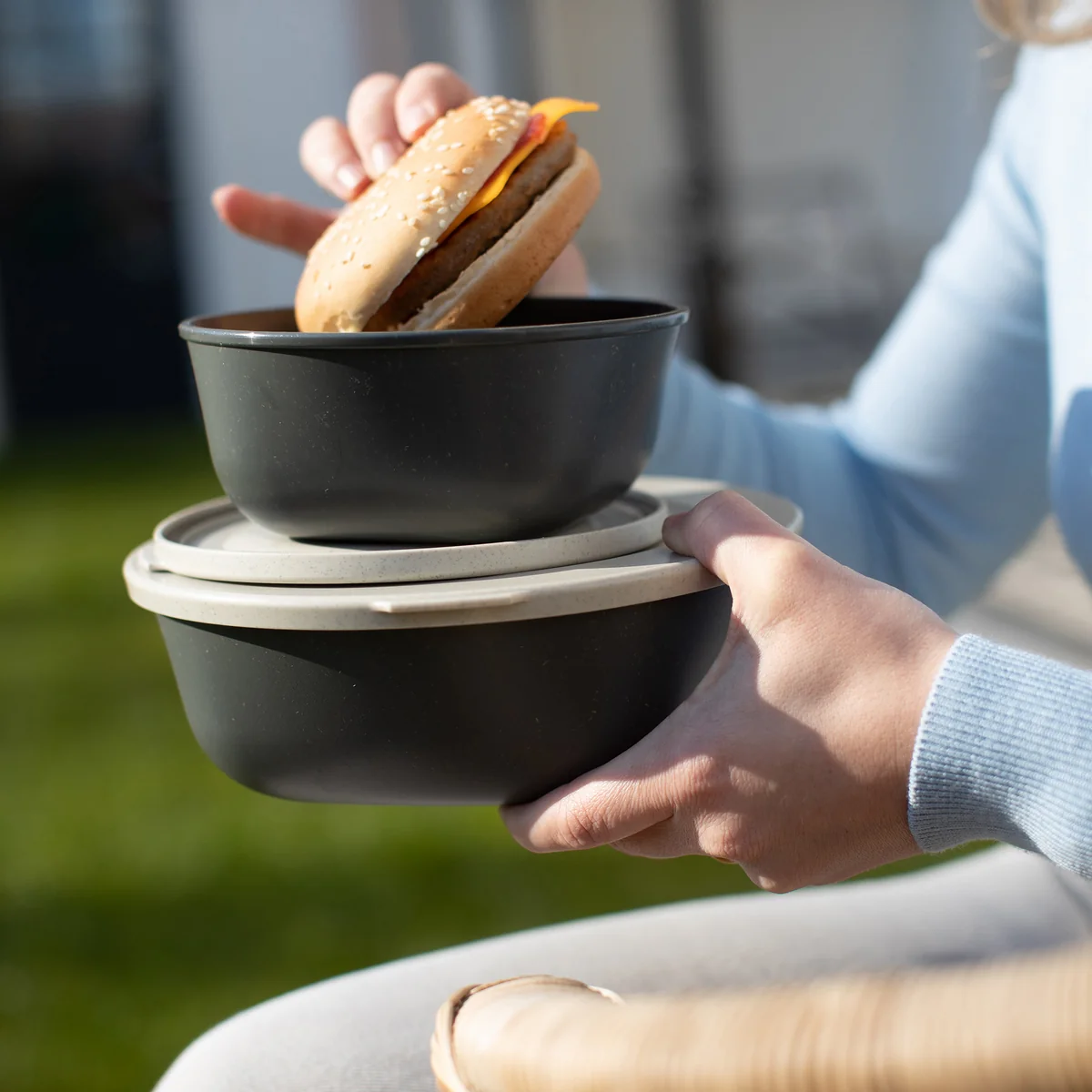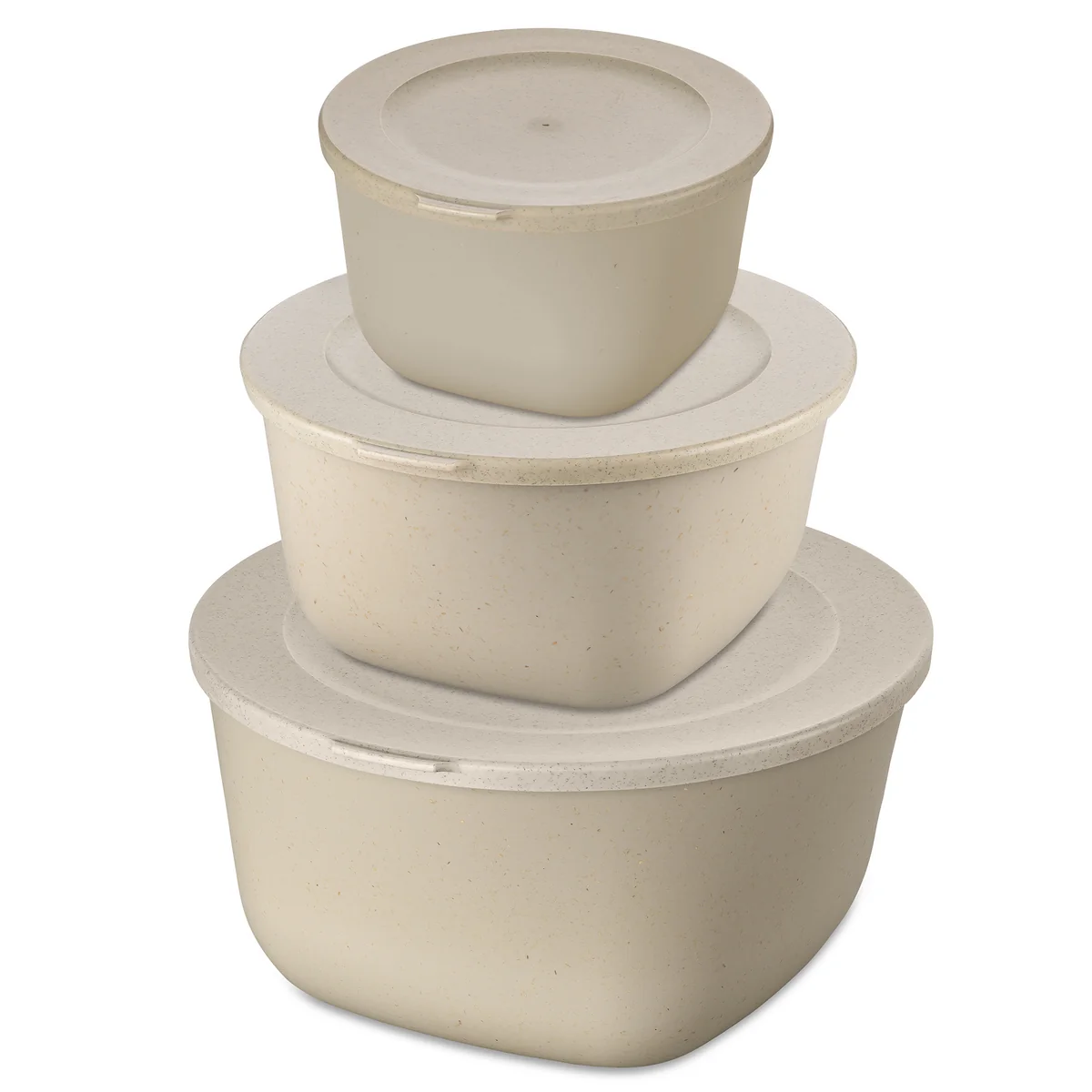 Koziol fabrique la Connect Boîte de conservation en thermoplastique avec cellulose. La boîte de conservation est ainsi écologique, durable, réutilisable, adaptée au contact alimentaire, recyclable et garantie sans formaldéhyde ni BPA. Tous les bols sont empilables les uns dans les autres et prennent ainsi un minimum de place dans l'armoire.