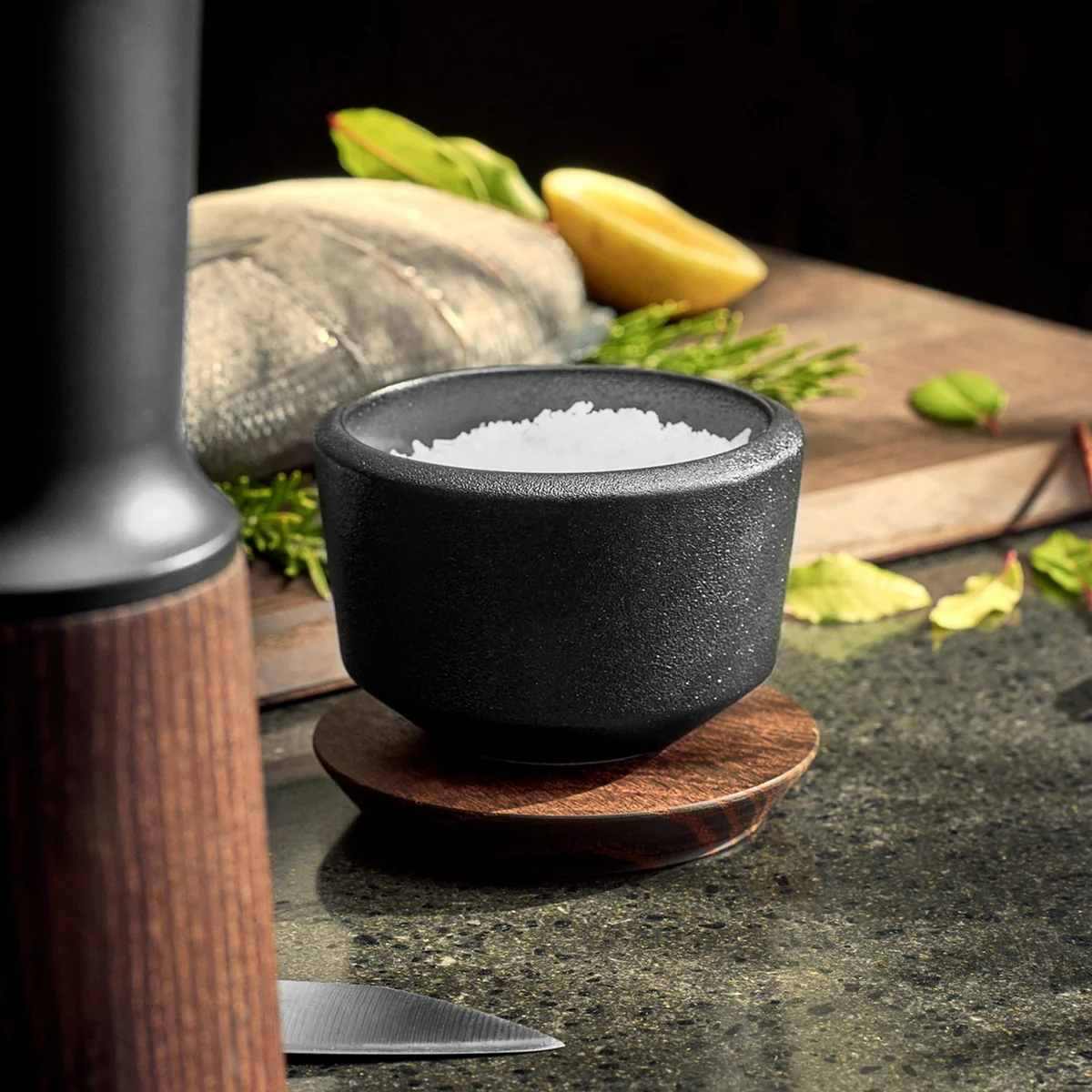 Conçu par Jesper Vollmer, le sel de ce bol sera protégé de la saleté et ne se périmera pas si vite. Le couvercle peut également servir de mini-plateau pour le bol.