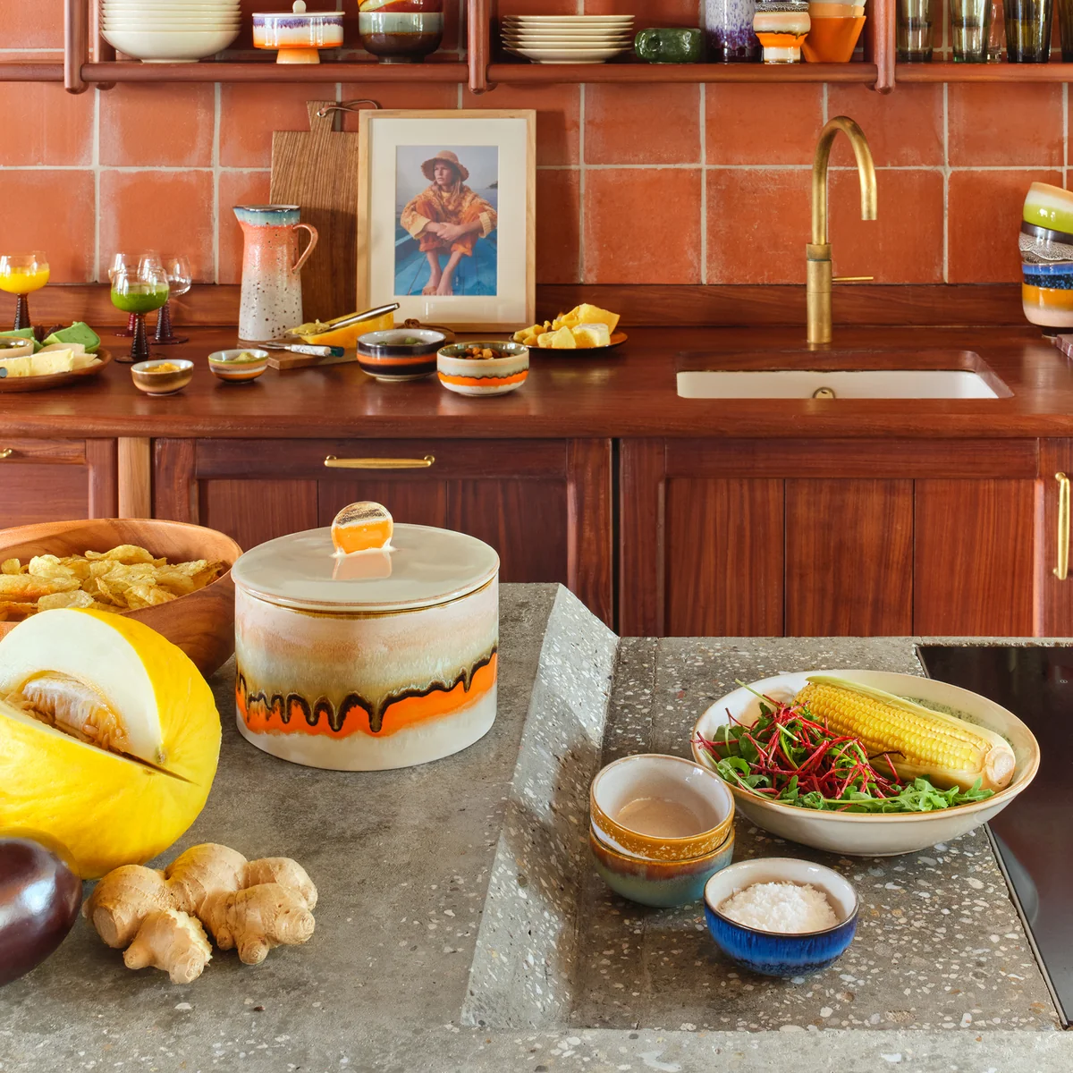 La série de vaisselle 70's de HKliving se compose de tasses, de gobelets, de bols, d'assiettes, de théières et de bien d'autres choses encore. Inspirée des années 70, la vaisselle attire l'attention dans la cuisine ou sur la table à manger. La vaisselle convainc par ses combinaisons de couleurs ludiques et son look rétro décoratif. Elle convient pour une utilisation quotidienne ou pour des occasions particulières.