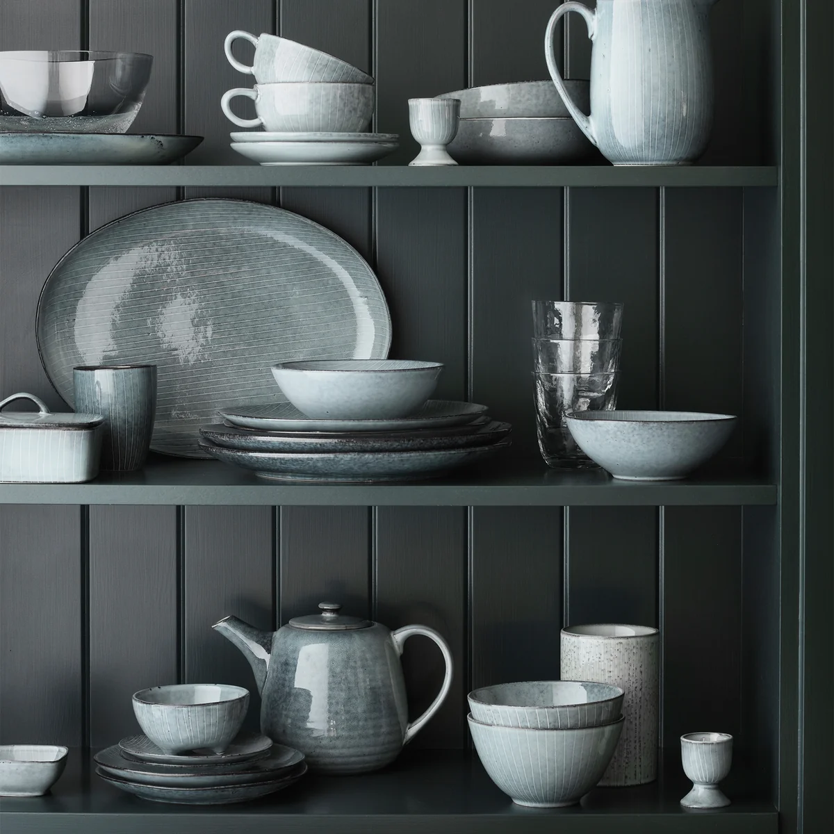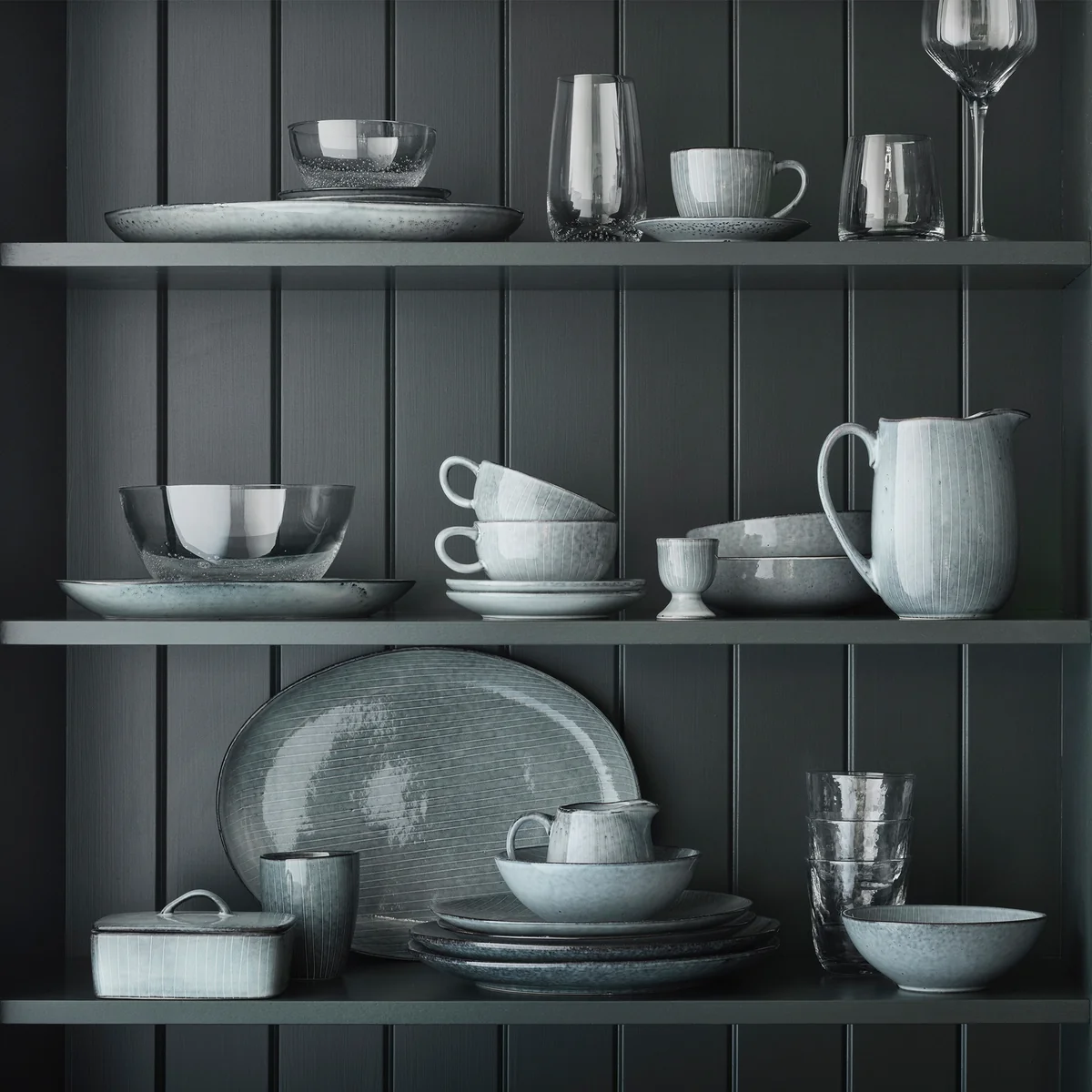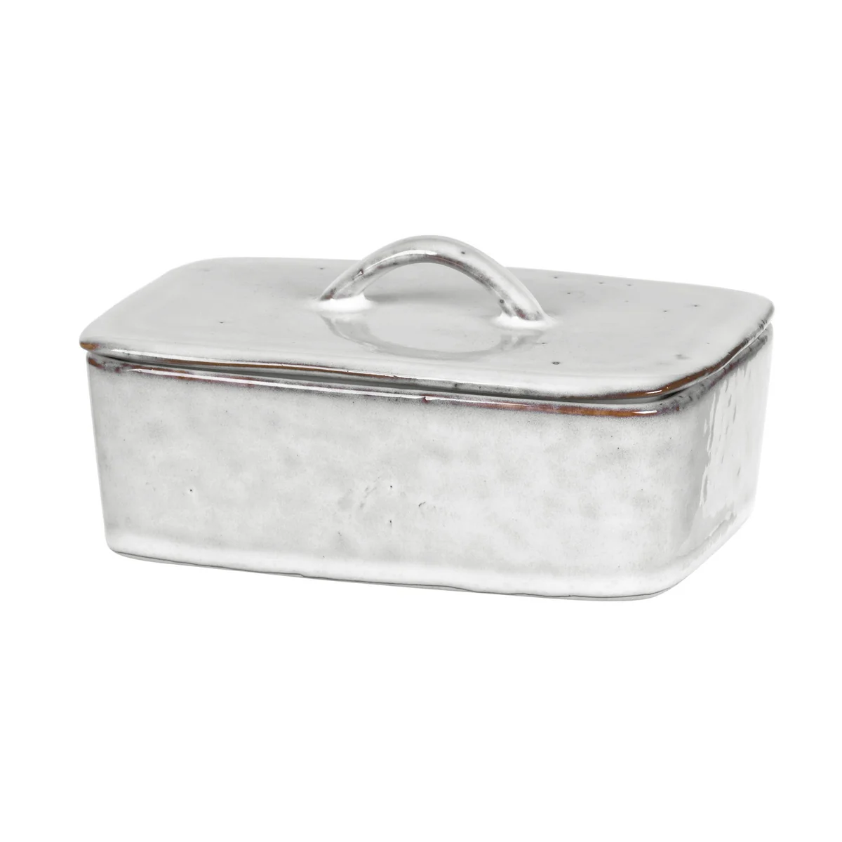 Le plat à beurre fait partie de la série de vaisselle nordique et est au cœur de la Broste Copenhagen . Depuis son introduction en 2009, des plats ont été trouvés dans de nombreux restaurants et cuisines privées à travers le monde. Le dégradé de couleur doux est créé par un processus de gravure spécial. Chaque pièce est unique car la glaçure réagit pendant le processus de cuisson et peut conduire à différentes textures et couleurs.