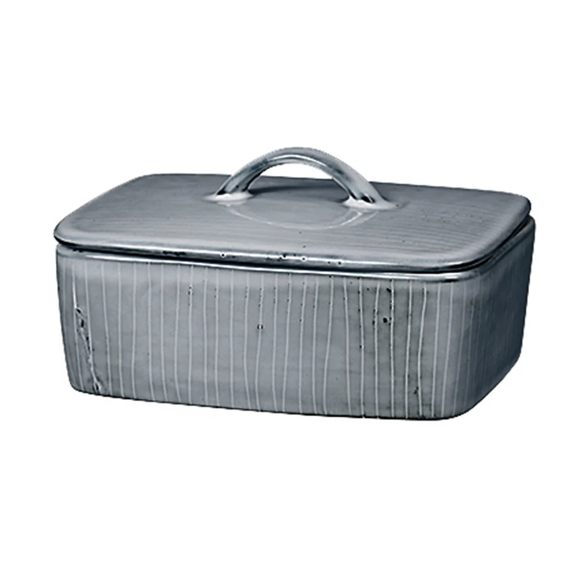 Le plat à beurre fait partie de la série de vaisselle nordique, cœur de la Broste Copenhagen . Depuis son introduction en 2009, des plats ont été trouvés dans de nombreux restaurants et cuisines du monde entier. Le dégradé de couleurs doux est créé par un processus de gravure spécial et représente la puissance d'origine de l'océan. Chaque pièce est unique car la glaçure réagit dynamiquement dans le four et peut conduire à différentes textures et couleurs.