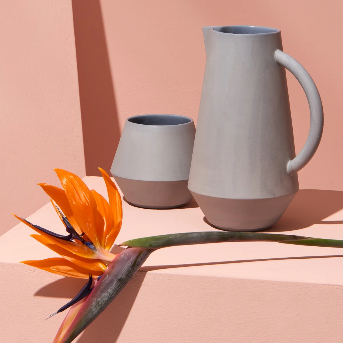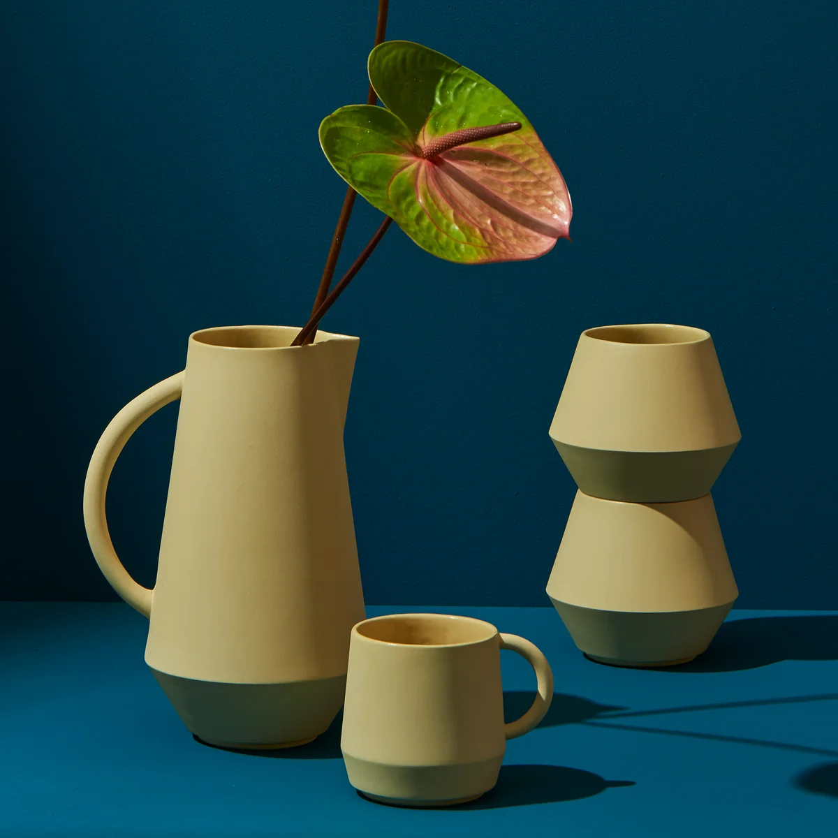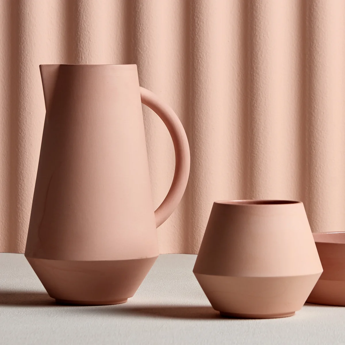Elle est disponible soit en version haute, qui rappelle la partie inférieure de la Unison Carafe en céramique de Schneid , ou en version plate.