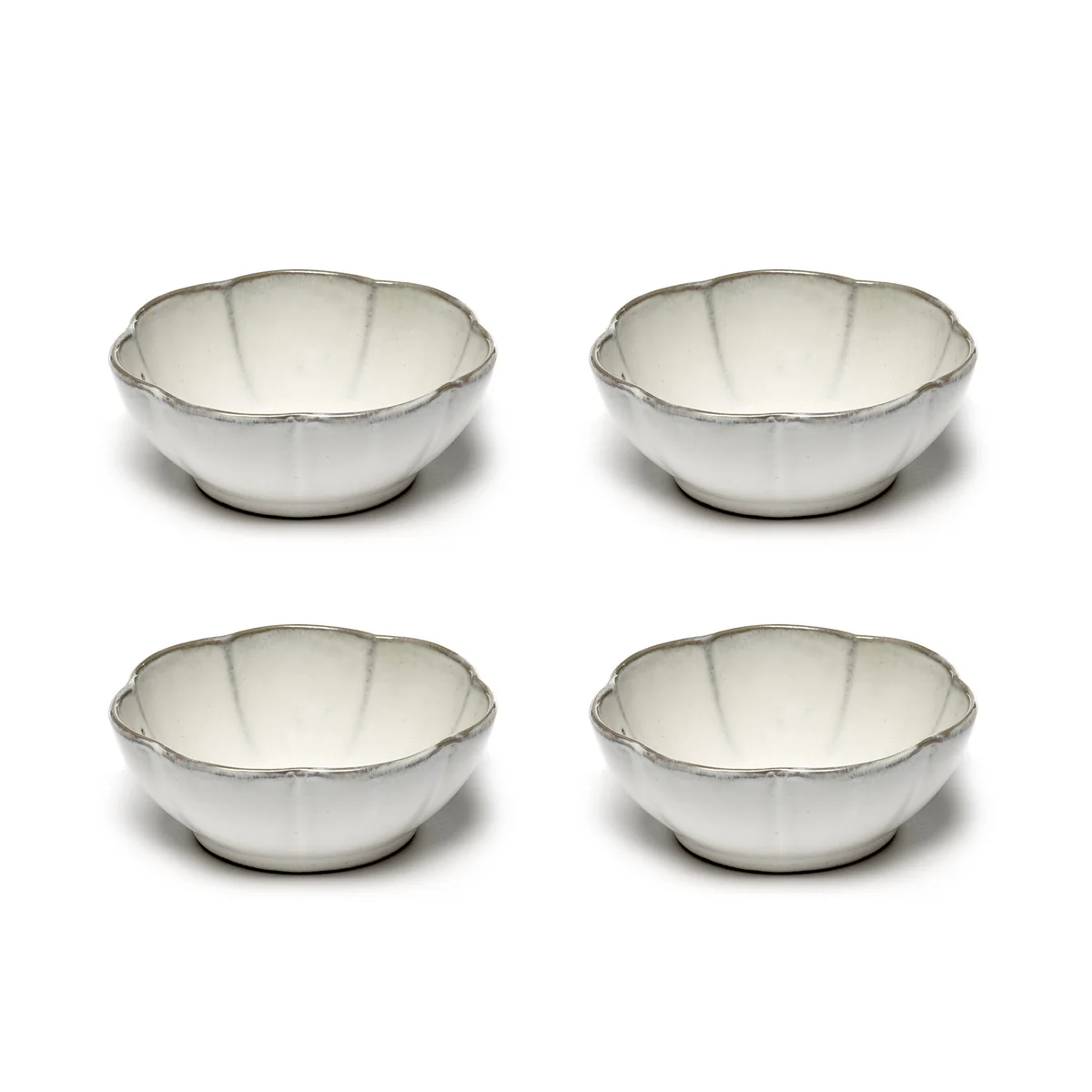 Le Inku bol de Serax se présente dans un look nordique, orné par la forme de fleur des coupelles. Les bols sont disponibles dans un set pratique de 4 pièces et conviennent à merveille pour servir de petits accompagnements ou des snacks. Les bols peuvent ainsi être utilisés aussi bien sur la table à manger que sur la table basse.