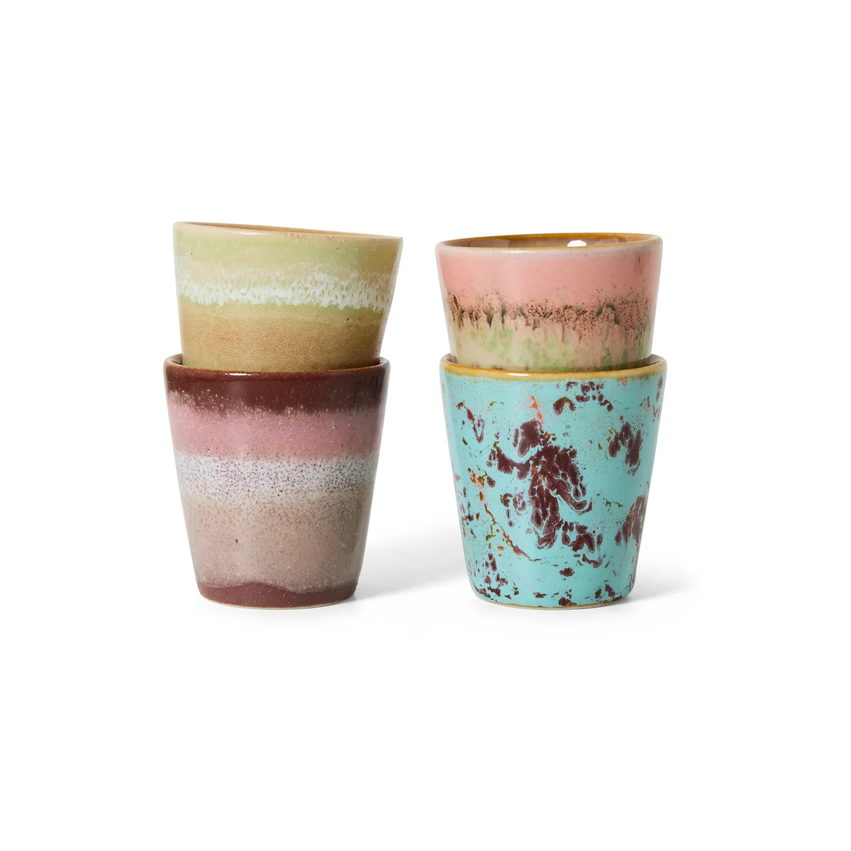 70's Une raison de se réjouir pour les collectionneurs de longue date comme pour les nouveaux venus : les tasses à espresso & de HKliving en grès sont aussi uniques que l'empreinte digitale d'une personne, car elles sont fabriquées et émaillées à la main. C'est ainsi que naissent les magnifiques motifs et couleurs qui valorisent individuellement chaque table à manger et chaque armoire à vaisselle. De plus, la porcelaine aux parois épaisses protège des mains brûlantes.