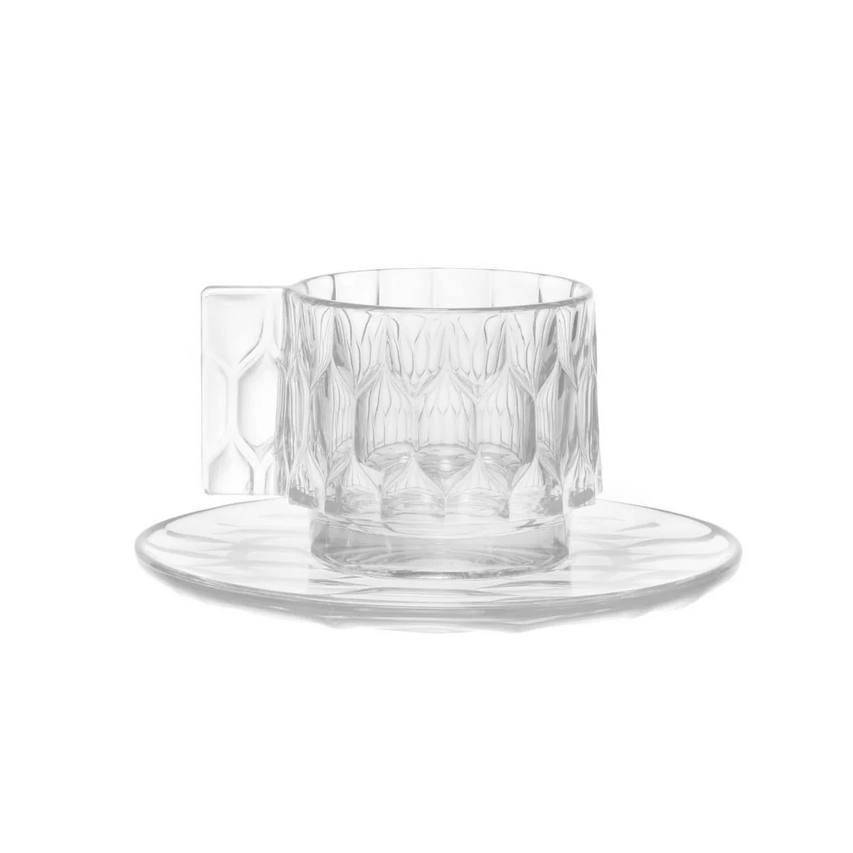 La tasse à expresso Jellies de Kartell est disponible avec la sous-tasse correspondante et séduit par sa forme originale. Composé de PMMA transparent ou teint, le set a une forme alvéolaire. C’est la raison pour laquelle la surface a l'apparence d'une gelée. Cet effet attire sûrement tous les regards et crée une touche moderne sur la table dressée de manière classique grâce aux coloris différents.