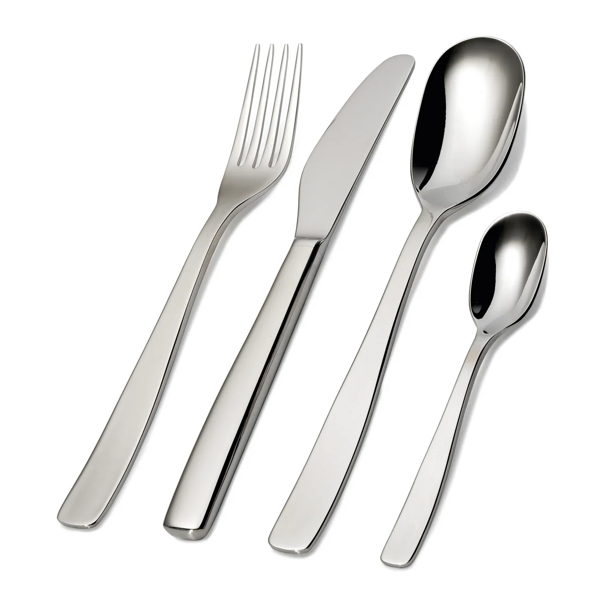 La coutellerie KnifeForkSpoon d'Alessi a été conçue par Jasper Morrison et est un ensemble de couverts qui convient aussi bien pour un usage quotidien que pour des occasions spéciales. L'ensemble de couverts de 24 pièces se compose de six cuillères à soupe, six fourchettes, six couteaux de table et six cuillères à café en acier inoxydable poli 18/. 10.