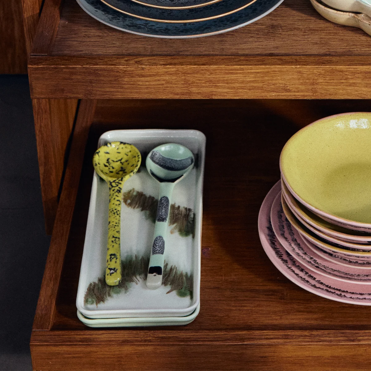 Le 70's Couverts de service de HKliving fait partie d'une collection qui réinterprète l'esprit créatif des années 70. Inspirée par le pop art, le surréalisme, l'expressionnisme et les formes abstraites, elle combine des surfaces artistiques avec des émaux structurés et un charme rétro inimitable. Chaque pièce ressemble à un objet d'art curaté qui confère à la table dressée personnalité et expressivité. Que ce soit pour les dîners ou pour un usage quotidien, ces couverts de service sont fonctionnels, durables et constituent une véritable déclaration de design.