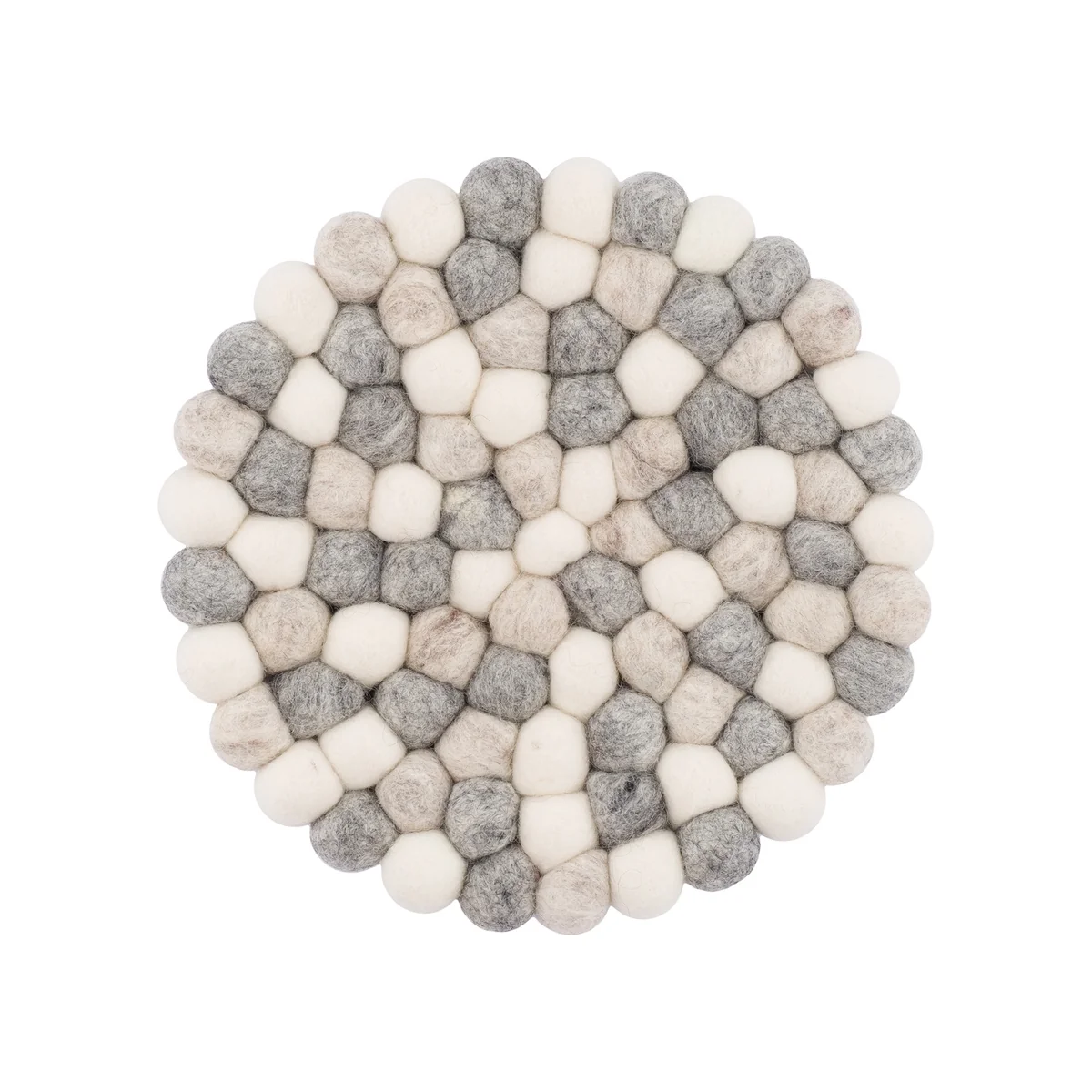 Les dessous de plat, comme les tapis de myfelt, sont réalisés en 100% laine vierge de Nouvelle-Zélande de la plus haute qualité mondiale. La laine non traitée est peignée à l’usine de tapis au Népal et lavée plusieurs fois. Puis vient le feutrage, qui constitue l’étape la plus compliquée. À la main, chaque balle est formée en plusieurs étapes dans sa forme finale. Enfin les petites balles finies sont cousues entre elles selon un processus développé spécialement par myfelt jusqu’au produit final.