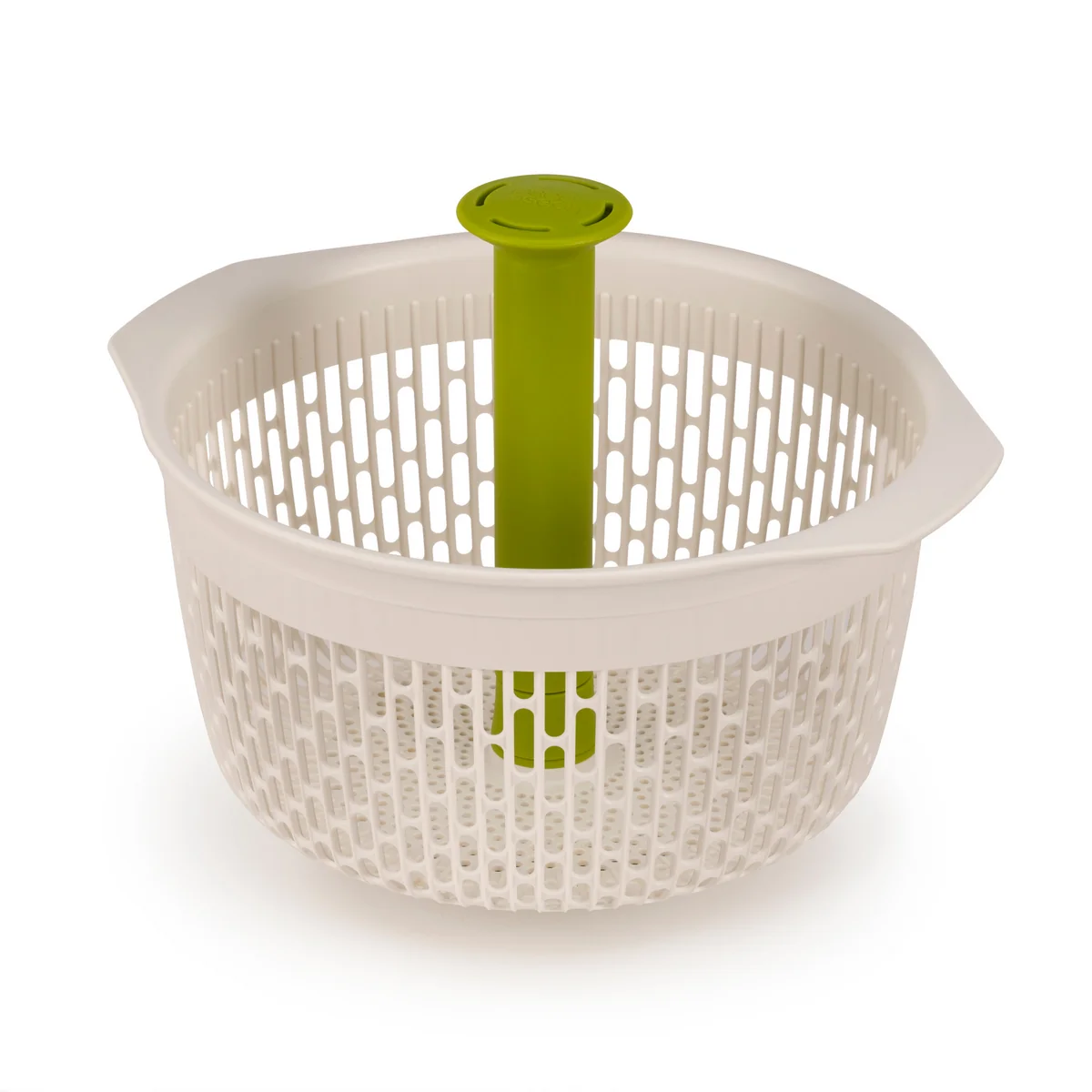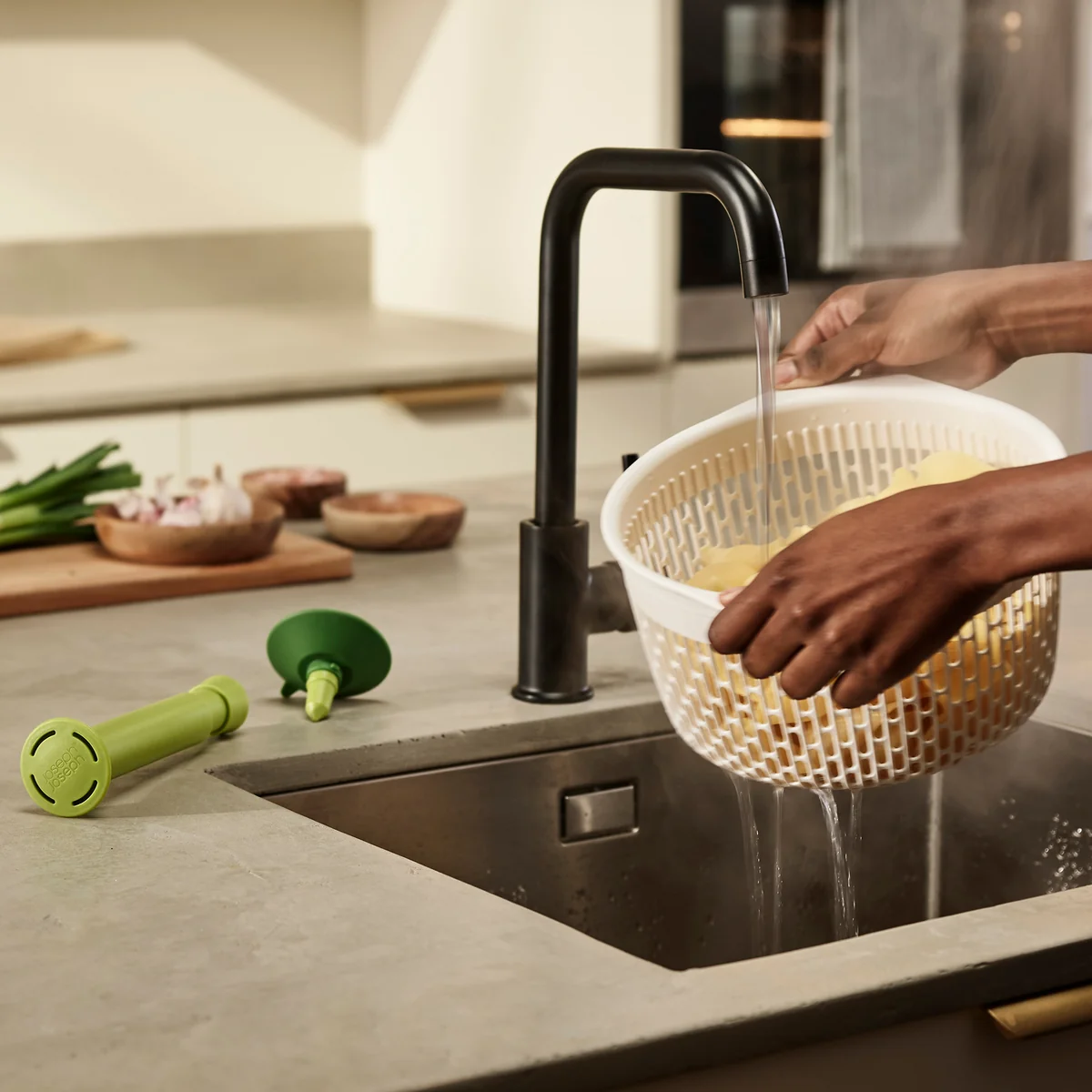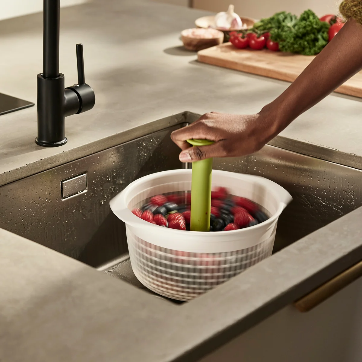 L'essoreuse à salade Spindola pour l'évier de Joseph Joseph séduit par son design innovant. La combinaison d'une essoreuse à salade et d'un égouttoir permet d'économiser un espace de rangement précieux. Pour préparer la salade, il suffit de fixer la tige et la ventouse à l'égouttoir. La salade est placée à l'intérieur et rincée soigneusement sous le robinet. Si l'égouttoir est fixé dans l'évier à l'aide de la ventouse, il est possible de pomper la tige de haut en bas pour faire tourner l'égouttoir et évacuer l'eau excédentaire. Si l'on souhaite utiliser l'égouttoir traditionnel, il suffit de démonter la tige et la ventouse et d'utiliser les poignées latérales.