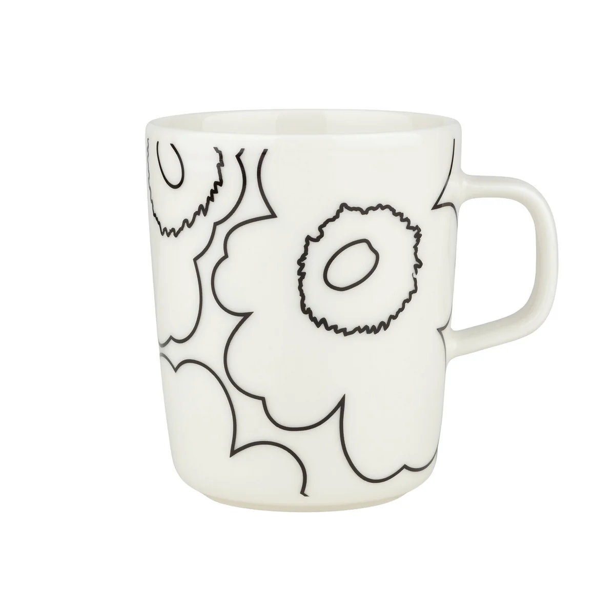 La tasse Oiva Piirto Unikko avec anse de Marimekko est fabriquée en faïence blanche et peut être utilisée au lave-vaisselle, au four, au micro-ondes et au congélateur.