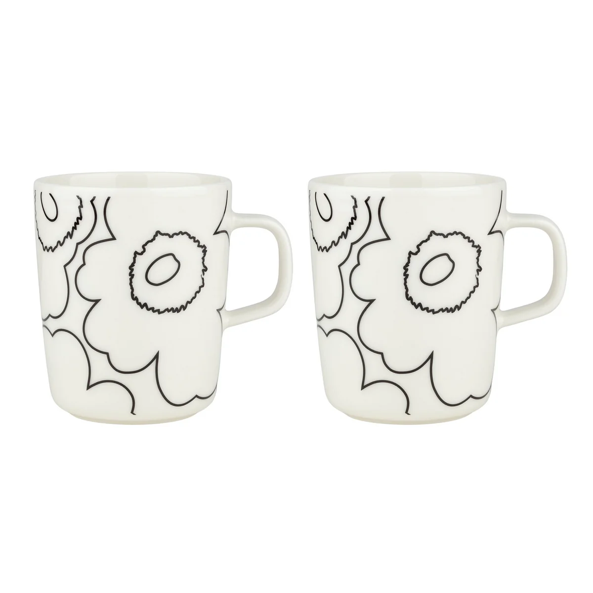La tasse Oiva Piirto Unikko avec anse de Marimekko est fabriquée en faïence blanche et peut être utilisée au lave-vaisselle, au four, au micro-ondes et au congélateur.