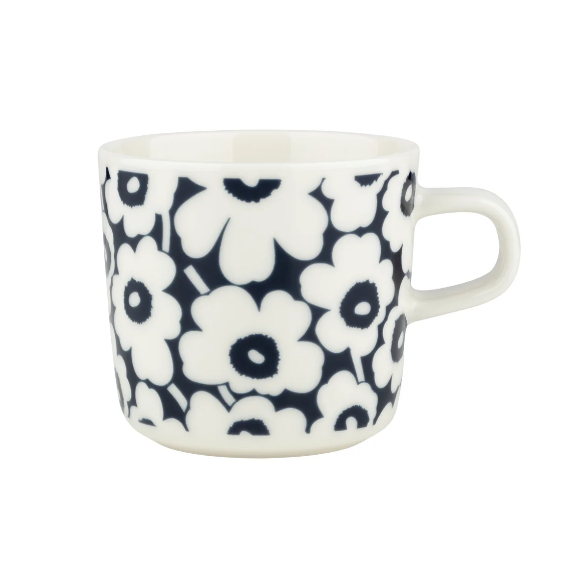 Le gobelet Oiva Pikkuinen Unikko avec anse de la maison Marimekko est fabriqué en faïence blanche et présente le motif Pikkuinen Unikko. Il passe au lave-vaisselle, au four, au micro-ondes et au congélateur.