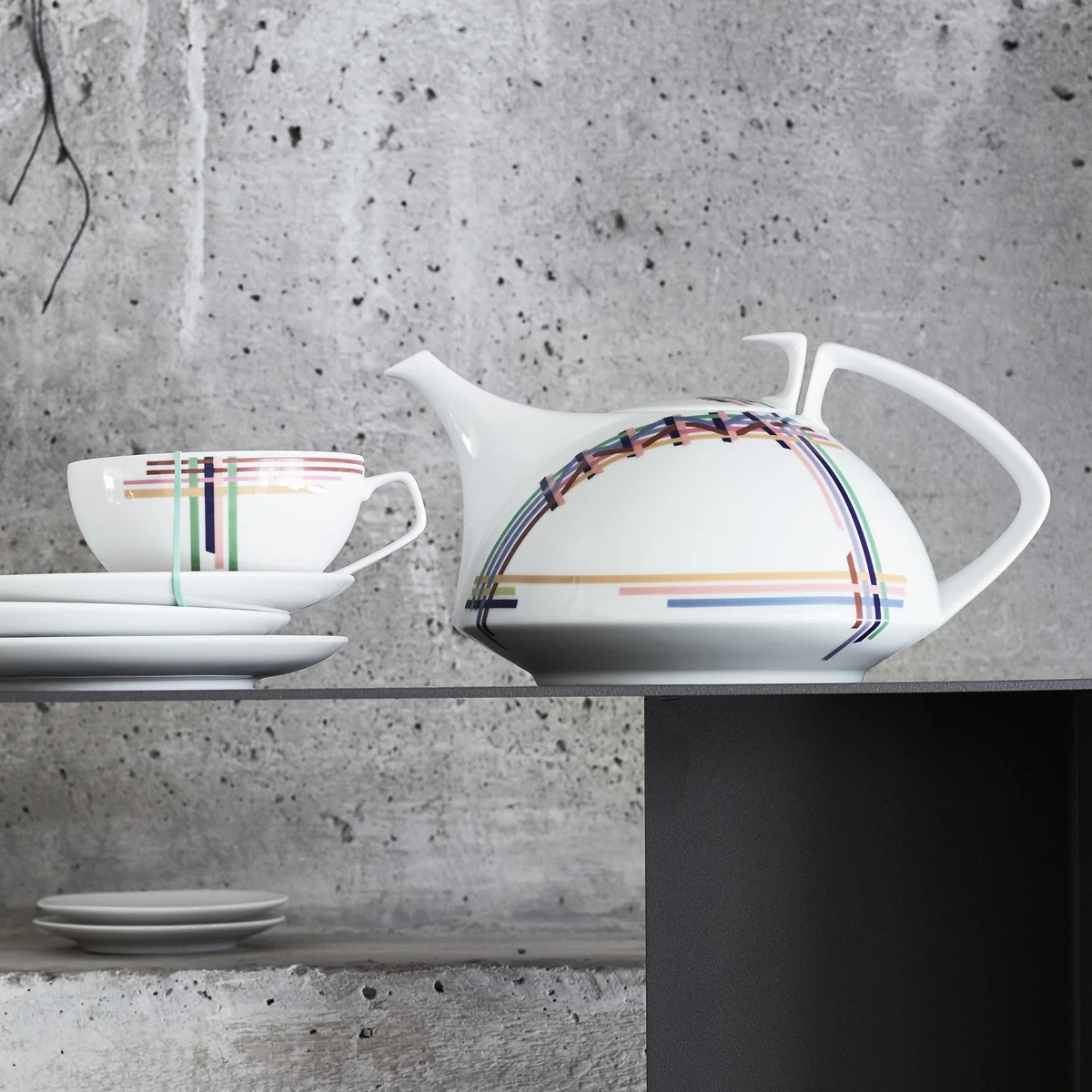 En plus des tasses blanches classiques, Rosental reprend le décor Stripes, également dessiné par Gropius, à l'occasion du 100e anniversaire du Bauhaus. Conçue à l'origine avec des rayures sur porcelaine blanche, Rosenthal lance aujourd'hui sur le marché une porcelaine noire avec un décor blanc.