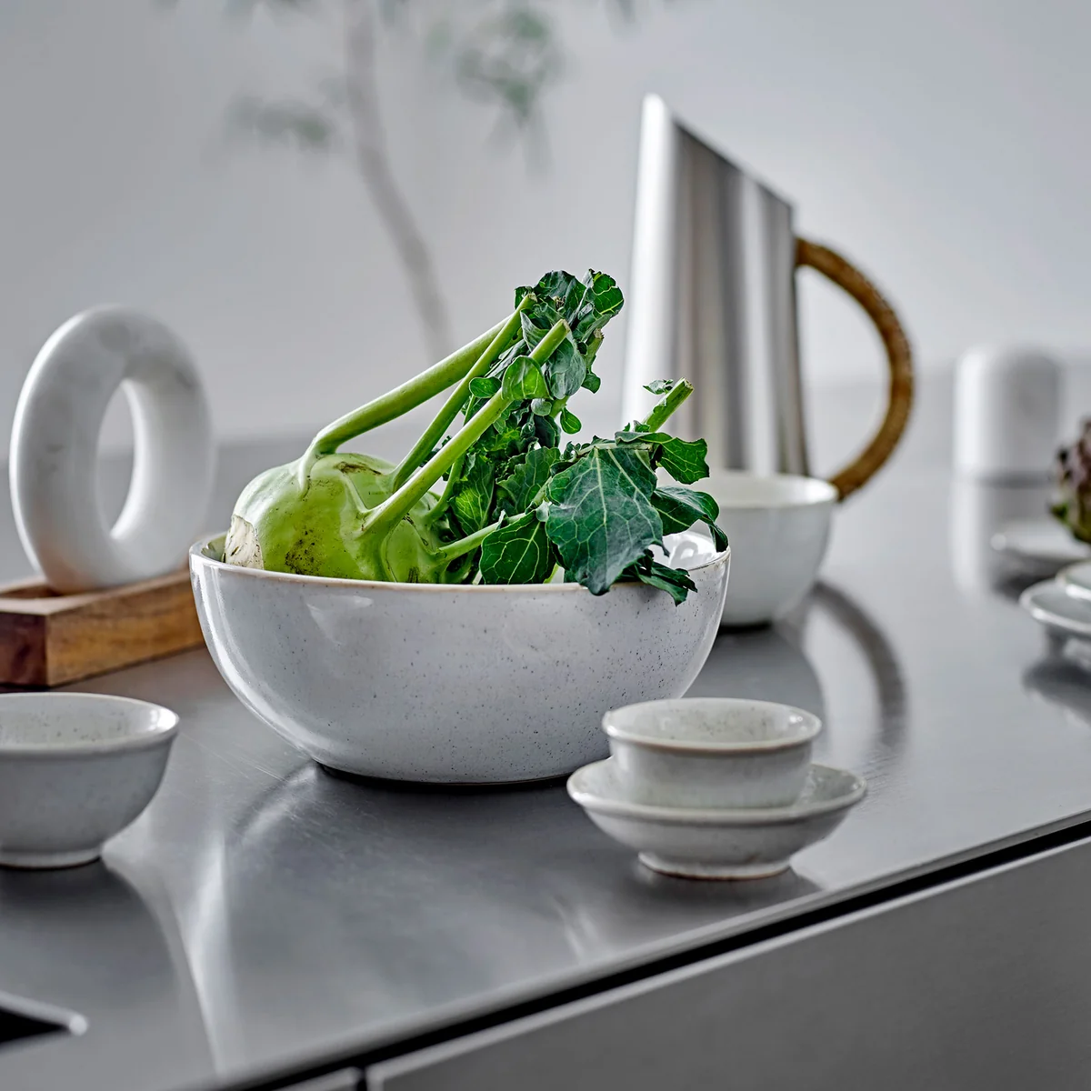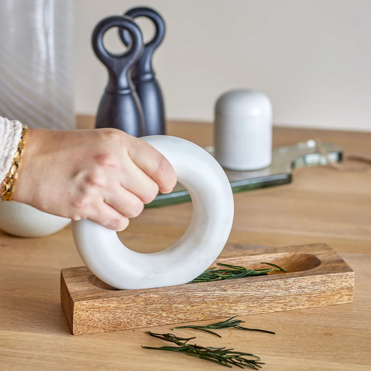Le mortier Manuella & pilon combine fonctionnalité et design élégant. Le mortier rond en blanc s'harmonise parfaitement avec le bois de manguier foncé du petit support et crée un aspect naturel et élégant. Idéal pour piler les épices et les herbes aromatiques - un élément pratique et décoratif qui enrichit chaque cuisine.