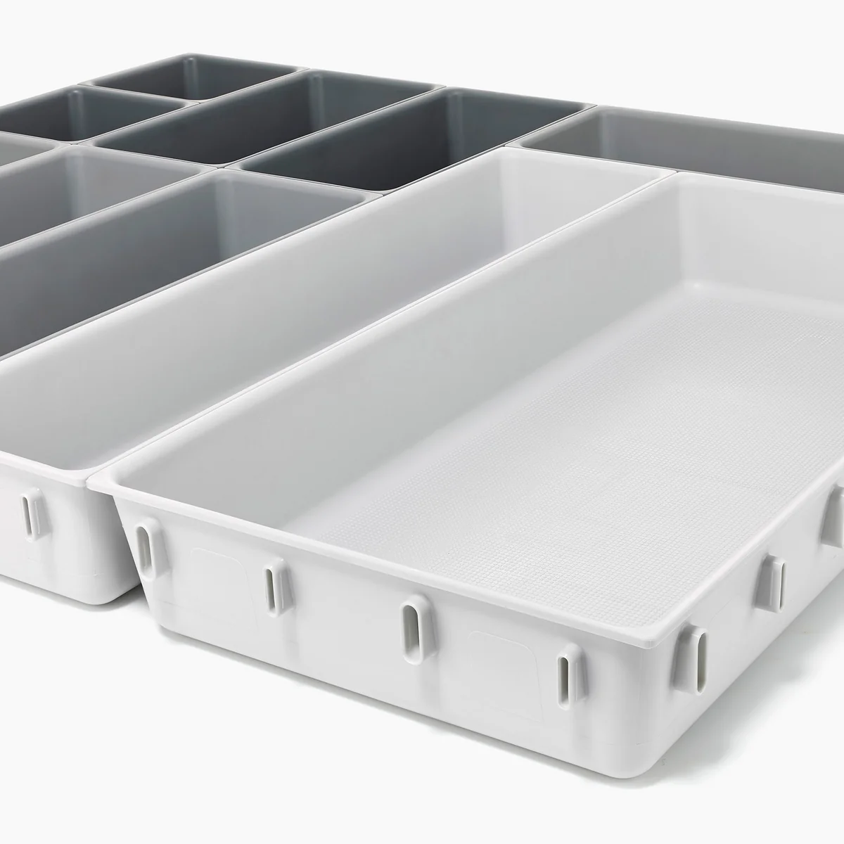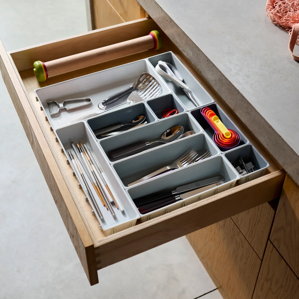 Le Blox Le set d'organisation des tiroirs de Joseph Joseph comprend des récipients individuels de différentes tailles qui peuvent être emboîtés tout autour et ainsi être disposés à volonté, en fonction de l'espace du tiroir. Bien entendu, les compartiments peuvent également être divisés et utilisés dans différents tiroirs.