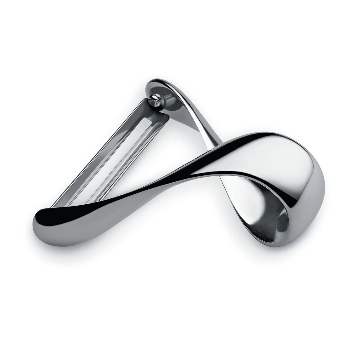 La forme de Sfrido en acier inoxydable poli rappelle un ruban stylisé qui serpente doucement en s’enroulant jusqu'à la lame. Les courbes du produit, créé par le mouvement des lignes garantissent une prise en main naturelle et ergonomiques. L’utilisateur peut décider de lui-même la façon dont il tiendra l’objet. L’éplucheur convient à tous types de légumes.