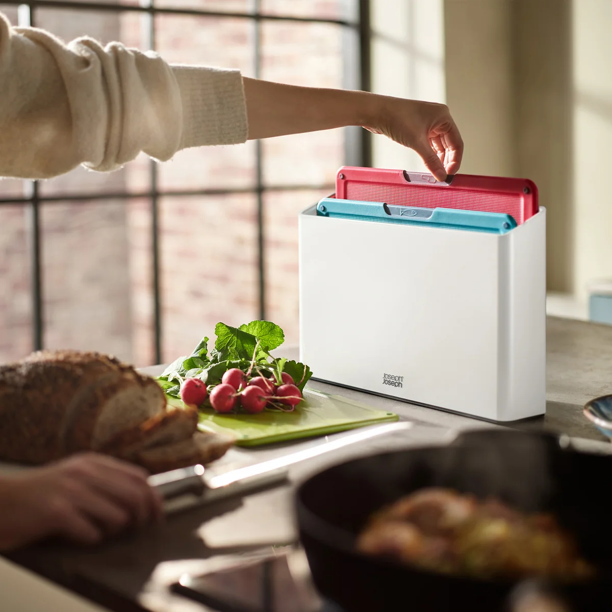 Les Folio Icon planches à découper de Joseph Joseph sont la réponse au défi de la contamination croisée dans votre cuisine. Ce set de 4 planches à découper antidérapantes et de qualité alimentaire est livré avec une boîte de rangement fine qui garantit l'ordre et l'hygiène. Le code couleur et les symboles sur les planches sont extrêmement utiles pour s'assurer que les différents types d'aliments sont traités séparément. Qu'il s'agisse de viande crue, de poisson cru, de légumes ou d'aliments cuits, les planches à code couleur indiquent clairement à quoi elles doivent être utilisées. Les surfaces de coupe sont non seulement faciles à nettoyer, mais aussi respectueuses des lames, afin de ménager vos couteaux. Le récipient fourni permet de ranger les planches séparément et garantit une bonne circulation de l'air. Avec les Folio Icon planches à découper, la cuisson dans votre cuisine devient plus sûre, plus hygiénique et plus efficace.