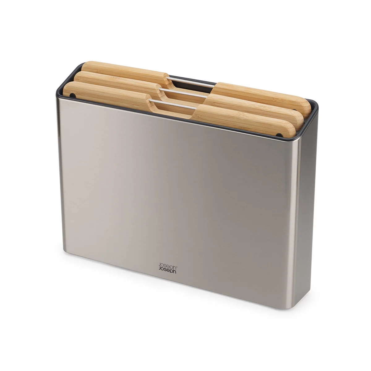 Les planches à découper Folio Steel de Joseph Joseph aident à maintenir l'ordre dans la cuisine. Quatre planches à découper de couleurs différentes sont rangées dans un boîtier étroit en acier inoxydable et peuvent être facilement retirées grâce à une poignée.