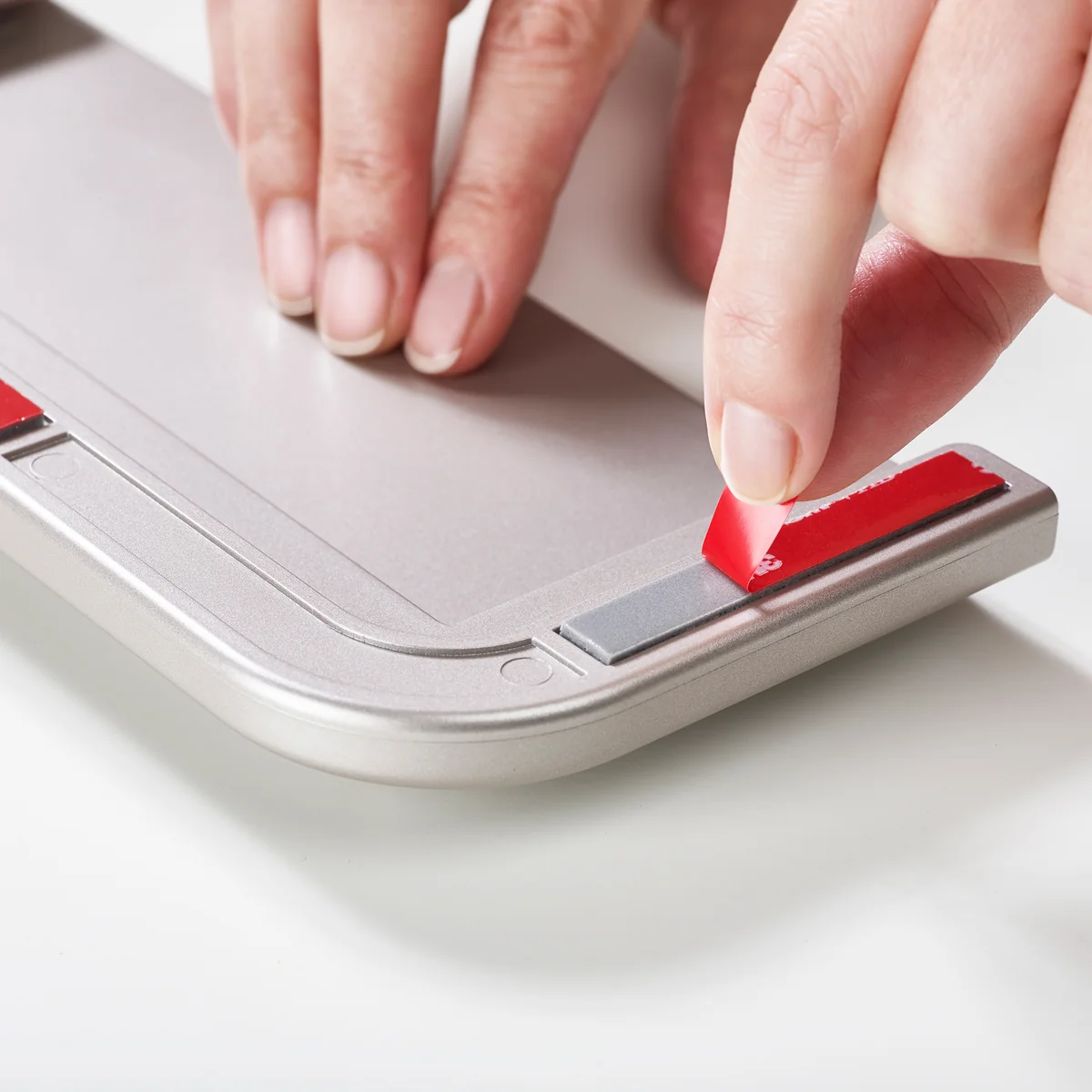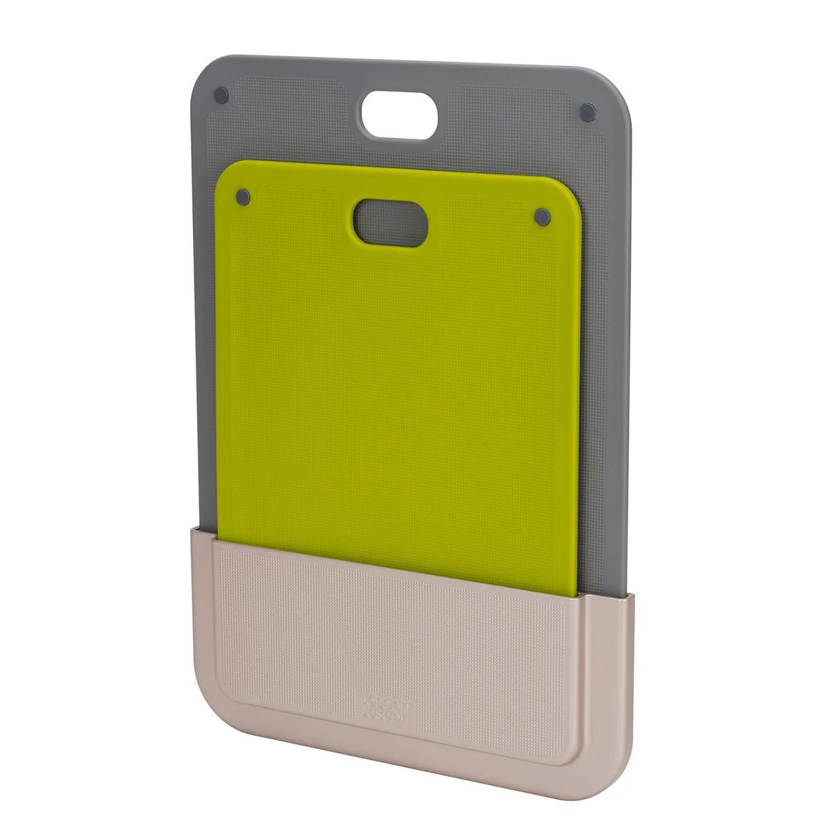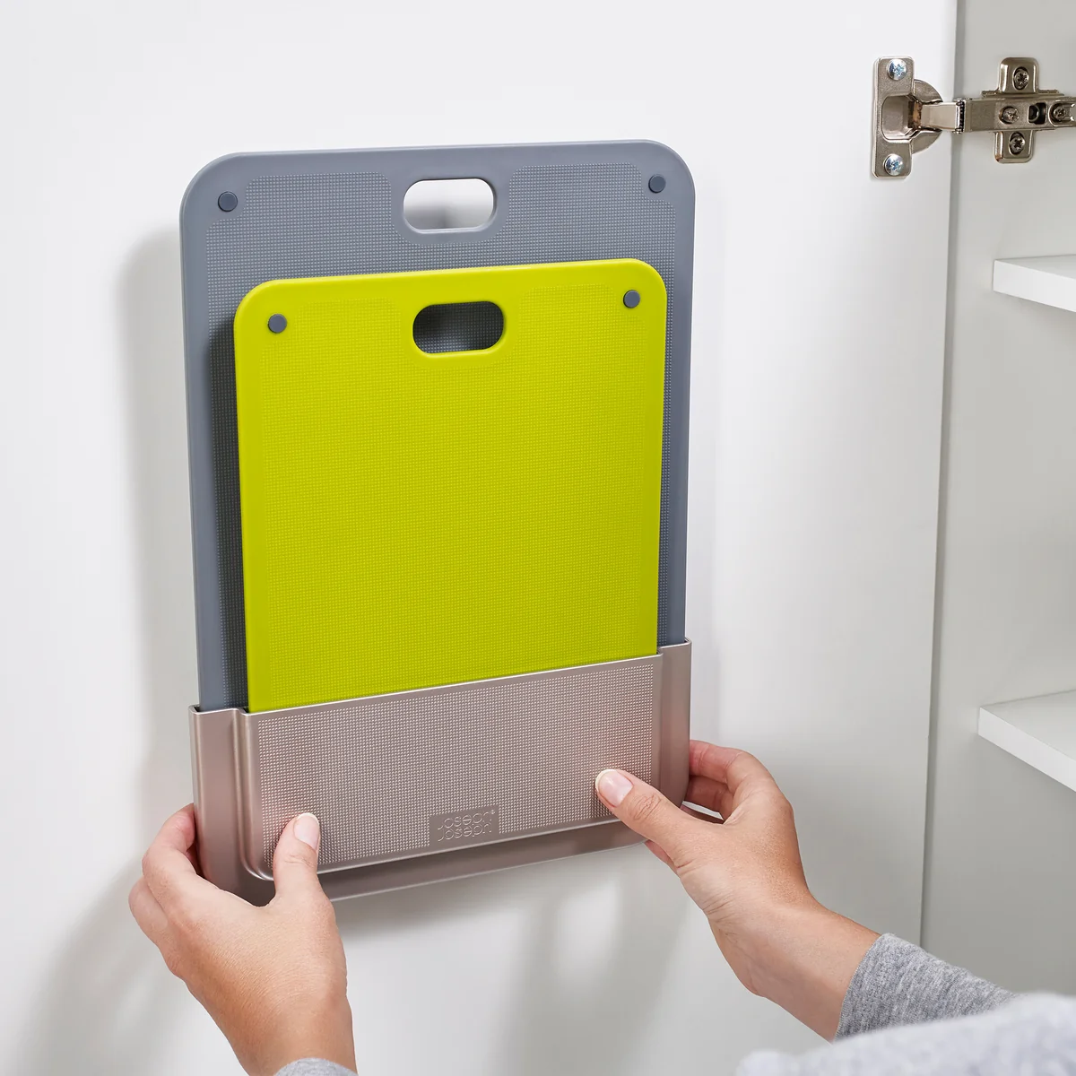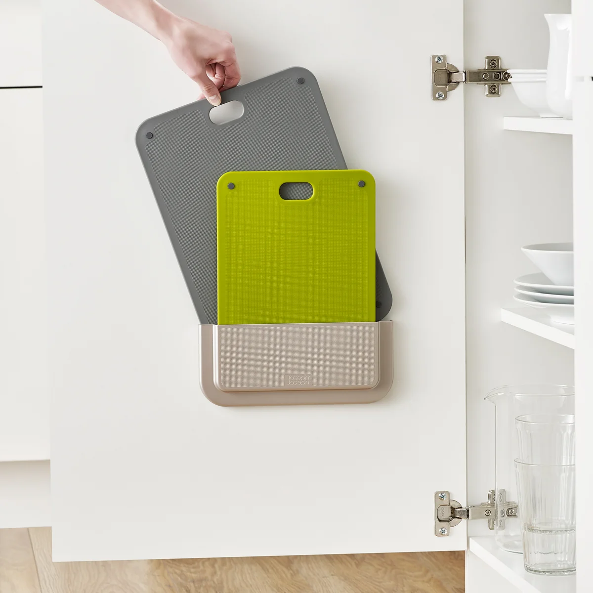 La planche à découper DoorStore Chop de Joseph Joseph crée de l'espace dans la cuisine en l'accrochant à l'intérieur des portes de l'armoire de cuisine. L'ensemble se compose de deux planches à découper de tailles différentes et d'une boîte de rangement mince, qui peut également être utilisée dans des armoires plus étroites. Aucun outil n'est nécessaire pour fixer l'ensemble, car le support est fixé avec du ruban adhésif 3M VHB.
