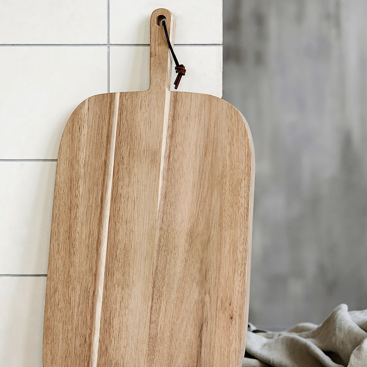 Planche à découper en bois d'acacia avec poignée et cordon en cuir