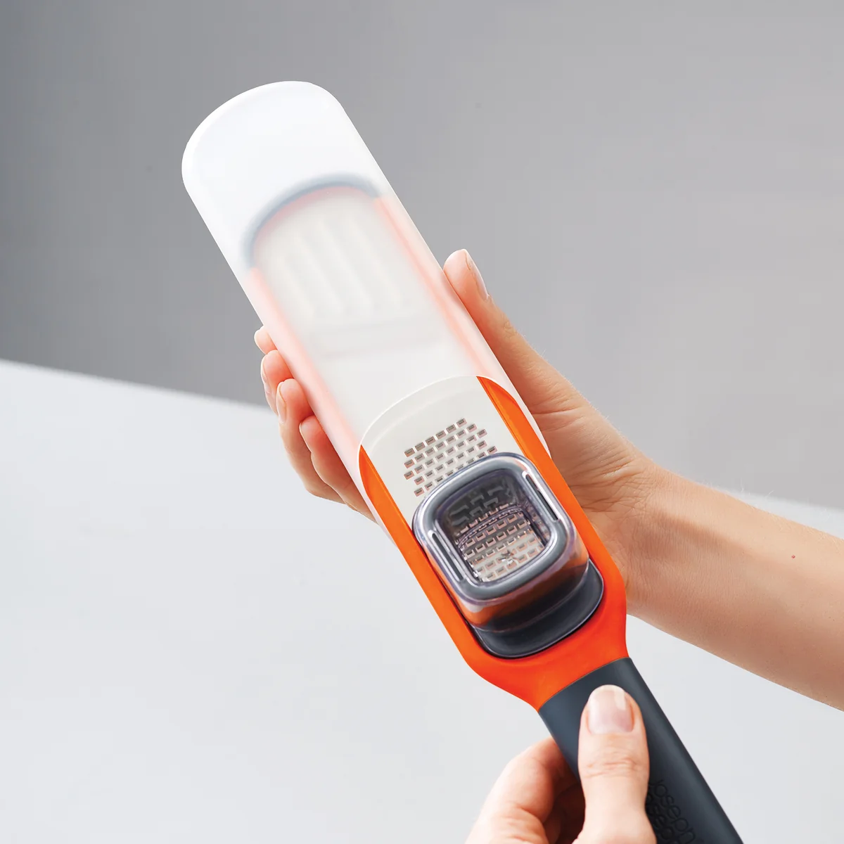 Râper des aliments de petite taille peut parfois être assez délicat, et si c'est fait à la main, il n'est pas rare de se blesser les doigts. C'est la raison pour laquelle que la mini-râpe et mandoline 2 en 1 Handi-Grate de Joseph Joseph a été conçue.