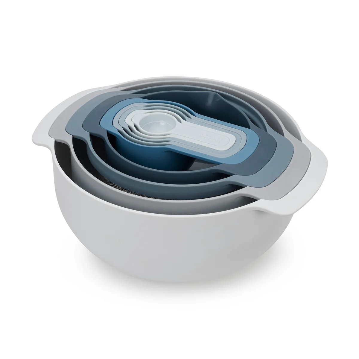 Nest 9 Plus de Joseph Joseph est la combinaison ultime d'ustensiles de cuisine. Avec cinq verres doseurs, deux saladiers, un tamis filtrant et une passoire, plus aucune recette ne vous posera problème.