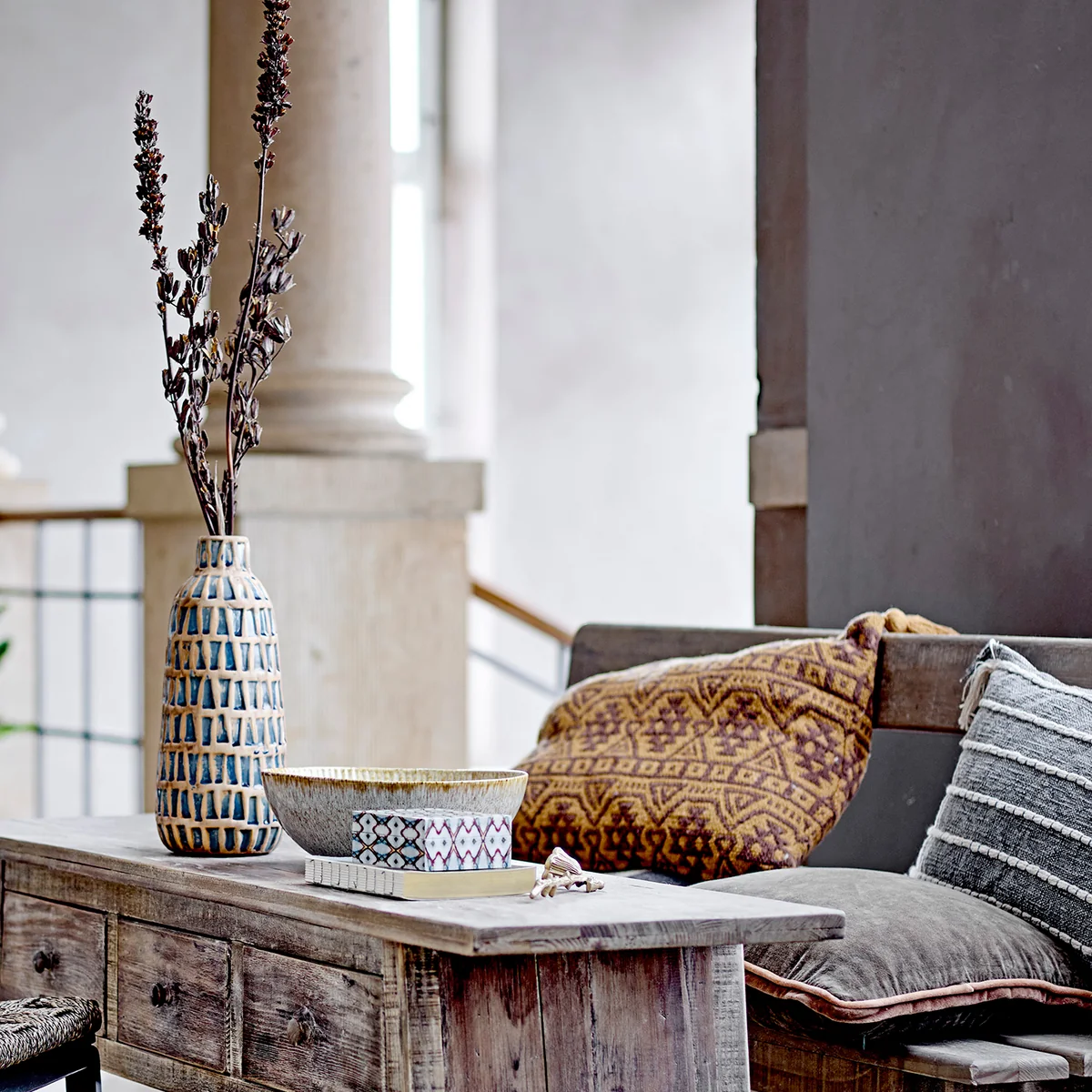 Le Fleur saladier de Creative Collection est en faïence dans un beau mélange de tons bleus, verts et bruns. Fleur signifie fleur en français. Les fleurs sont uniques, particulières et se distinguent par leur aspect. La série de vaisselle a les mêmes caractéristiques ; chaque pièce est peinte à la main et en raison de l'émail réactif, les couleurs varient magnifiquement au sein de la série.