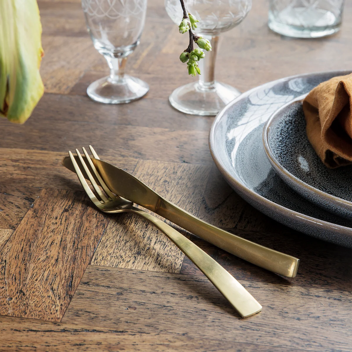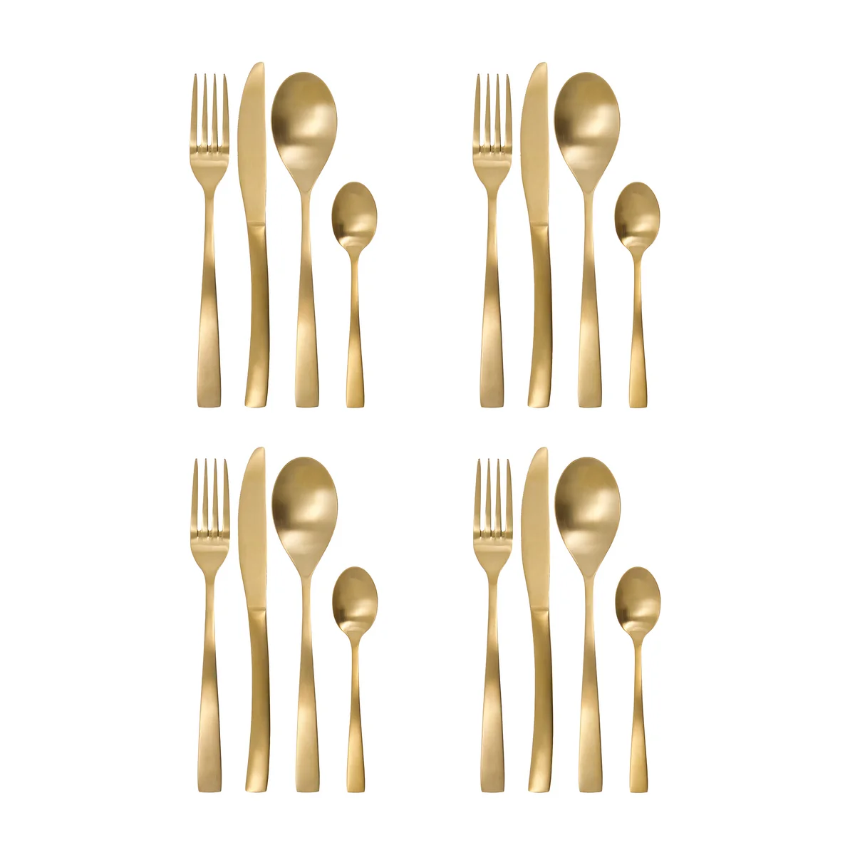 Ce set de couverts de 16 pièces au look doré apporte luxe et élégance à votre table. Fabriqué en acier inoxydable de haute qualité, il allie un design intemporel à la durabilité et au confort. Parfait pour les occasions spéciales et l'usage quotidien.