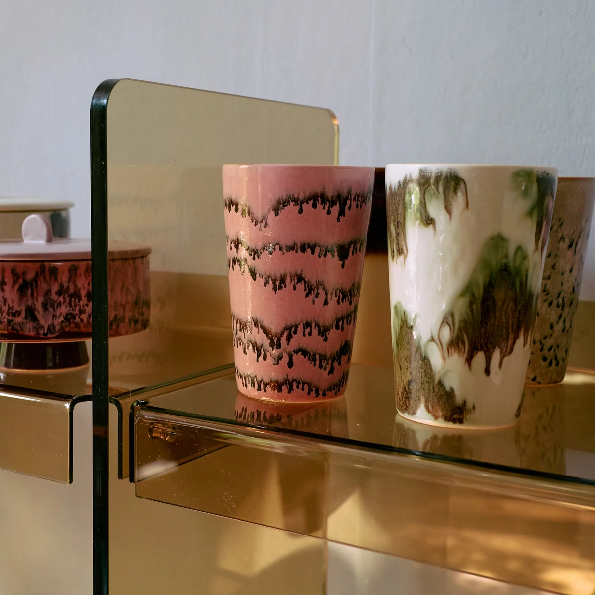 Une raison de se réjouir pour les collectionneurs de longue date comme pour les nouveaux venus : les tasses à thé 70's de HKliving en grès sont aussi uniques que l'empreinte digitale d'une personne, car elles sont fabriquées et émaillées à la main. C'est ainsi que naissent les magnifiques motifs et couleurs qui valorisent individuellement chaque table à manger et chaque vaisselier.