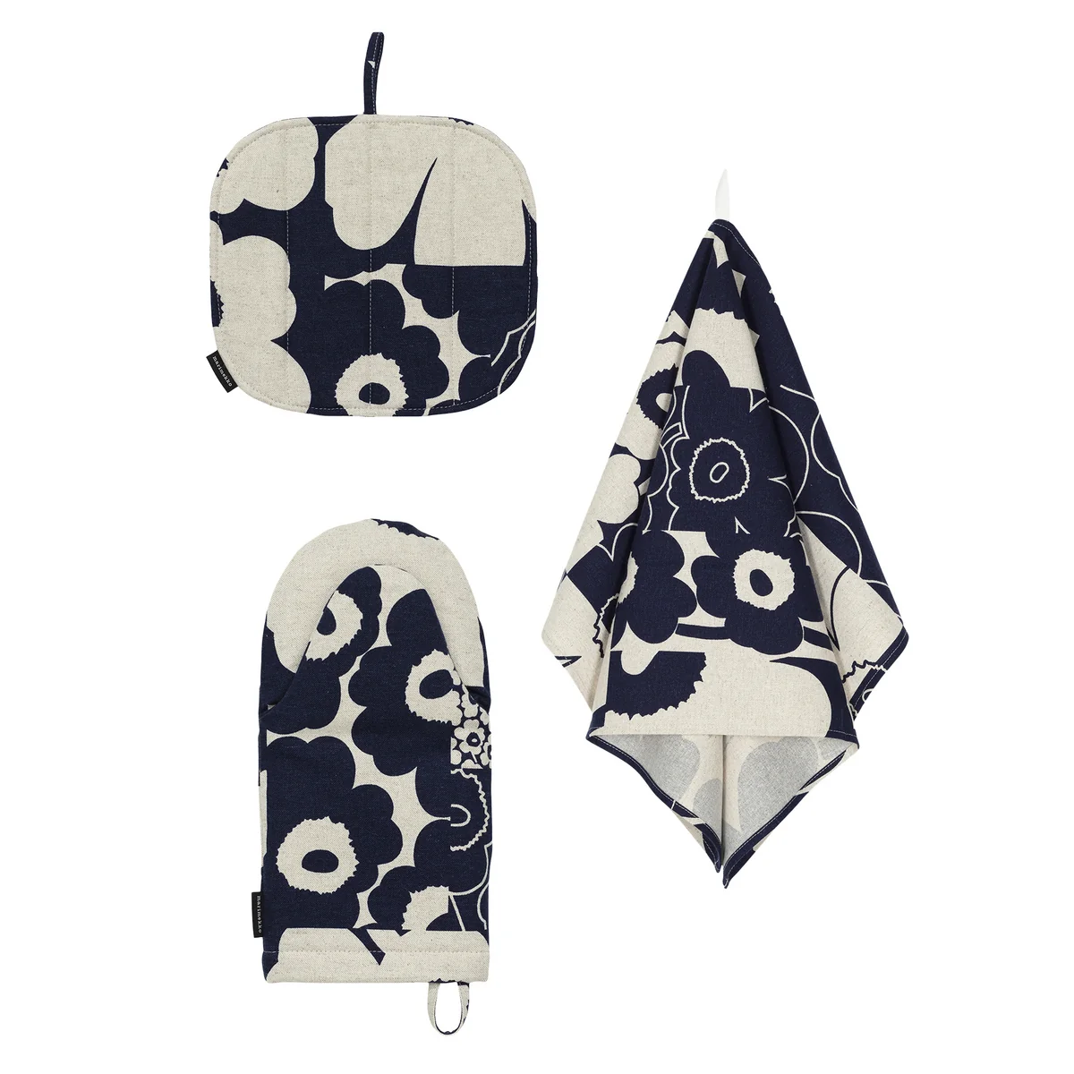 Le set de cuisine Unikko Kollaasi de Marimekko se compose d'un gant de four, d'une manique et d'un torchon de cuisine, tous fabriqués dans un mélange de coton et de lin non blanchi et soigneusement imprimés à Helsinki. Le gant de four et la manique ont un rembourrage et des boucles de suspension, tandis que le torchon de cuisine a une boucle de suspension sur le bord long.