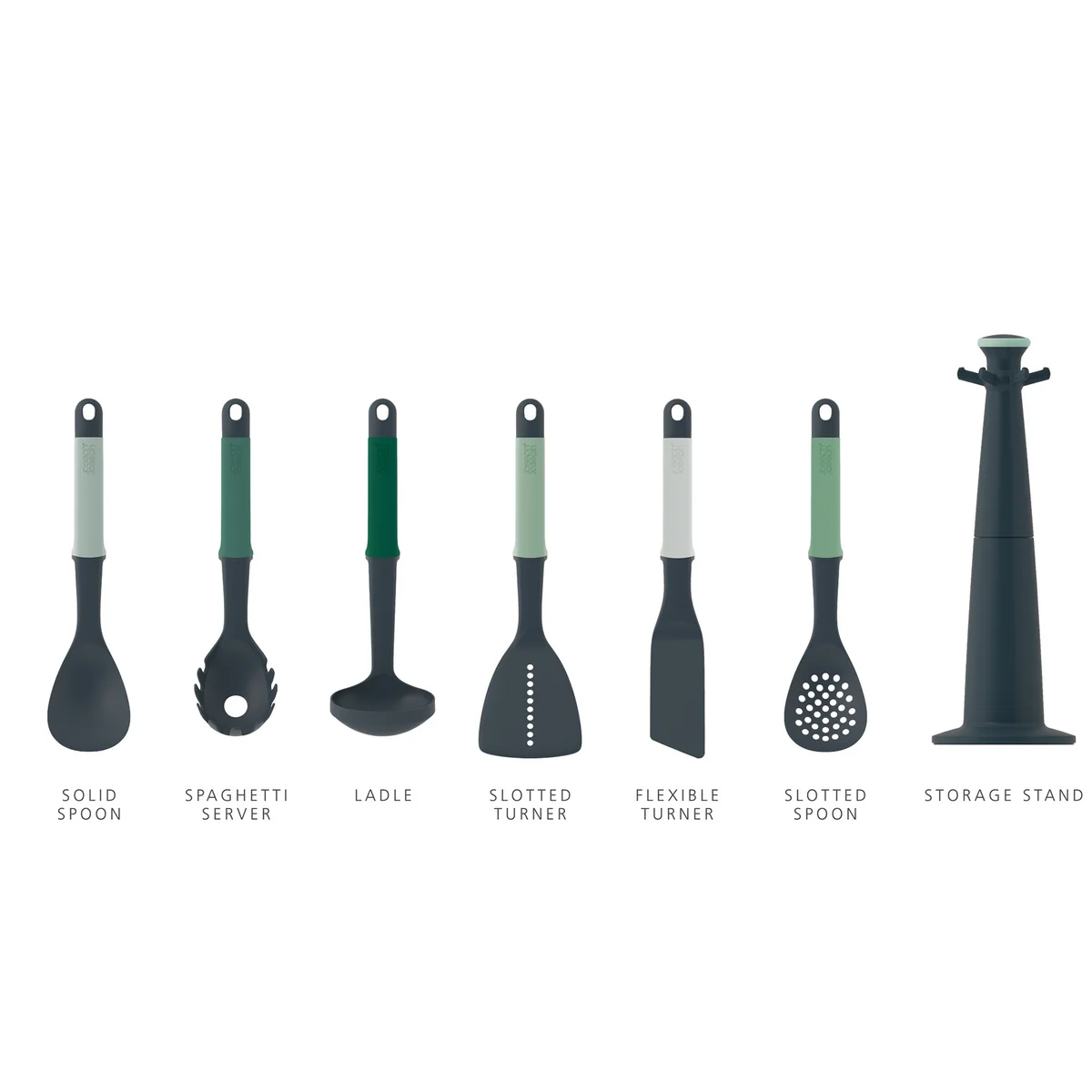 La série Elevate de Joseph Joseph est un set composé de six ustensiles de cuisine principaux : une louche, une écumoire, une spatule à trous, une cuillère à spaghetti, une cuillère à servir et une spatule. Sur chaque ustensile, on retrouve un trou au niveau de la poignée à la forme ergonomique qui permet de le suspendre facilement au socle du carrousel Elevate.