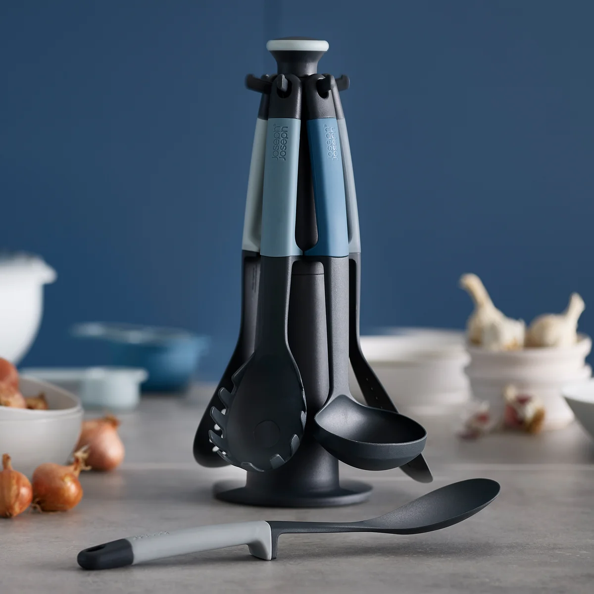 Le carrousel Elevate de Joseph Joseph est un set pratique constitué de six ustensiles de cuisine innovants et d'un socle rotatif, pratique. Les ustensiles de cuisine ont été conçus pour apporter plus d'ordre et d'hygiène dans la cuisine. Grâce au socle rotatif, ils sont toujours à portée de main.