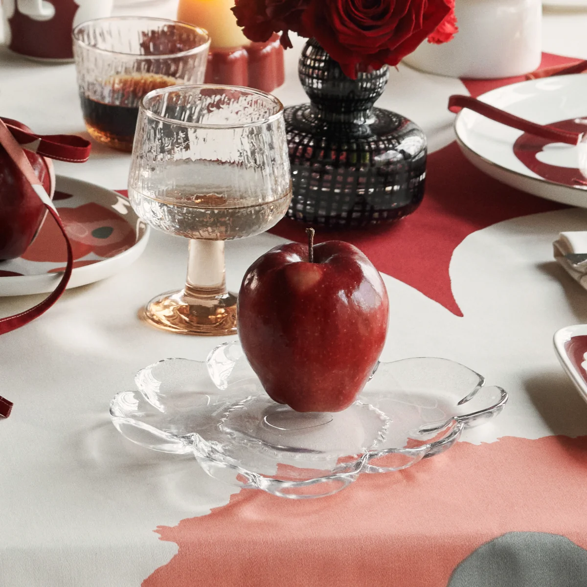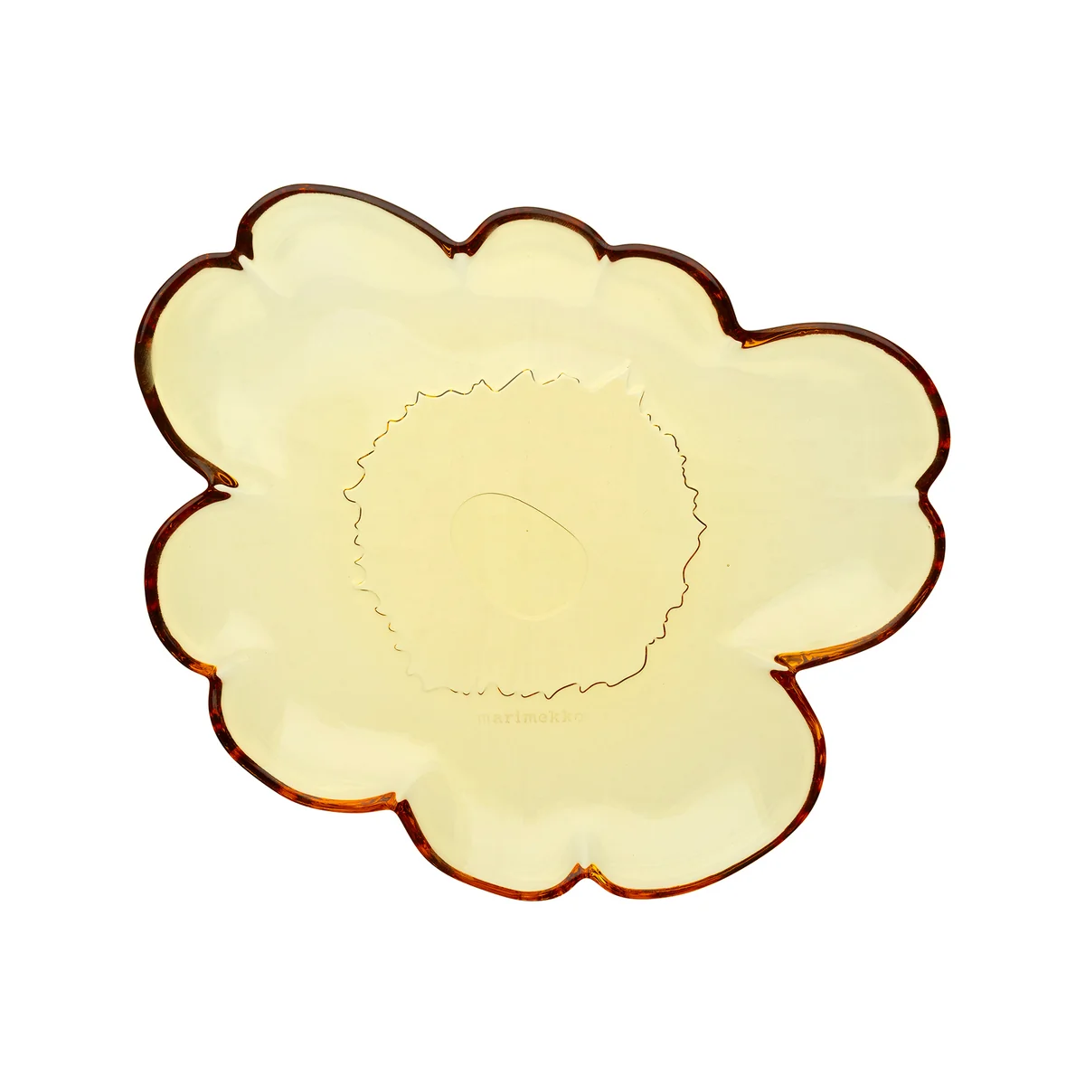 L'assiette en verre Unikko en forme de fleur de Marimekko . Il est recommandé de laver cette assiette à la main afin de préserver son design unique. Elle peut être lavée au lave-vaisselle, mais avec précaution, car le design prononcé peut être endommagé si elle entre en contact avec d'autres ustensiles.
