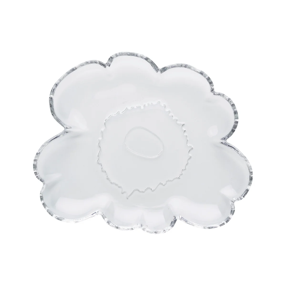 L'assiette en verre Unikko en forme de fleur de Marimekko . Il est recommandé de laver cette assiette à la main afin de préserver son design unique. Elle peut être lavée au lave-vaisselle, mais avec précaution, car le design prononcé peut être endommagé si elle entre en contact avec d'autres ustensiles.