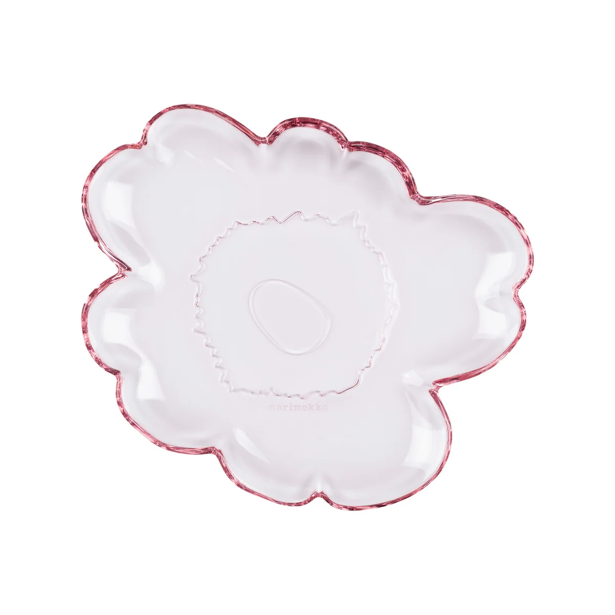 L'assiette en verre Unikko en forme de fleur de Marimekko . Il est recommandé de laver cette assiette à la main afin de préserver son design unique. Elle peut être lavée au lave-vaisselle, mais avec précaution, car le design prononcé peut être endommagé si elle entre en contact avec d'autres ustensiles.