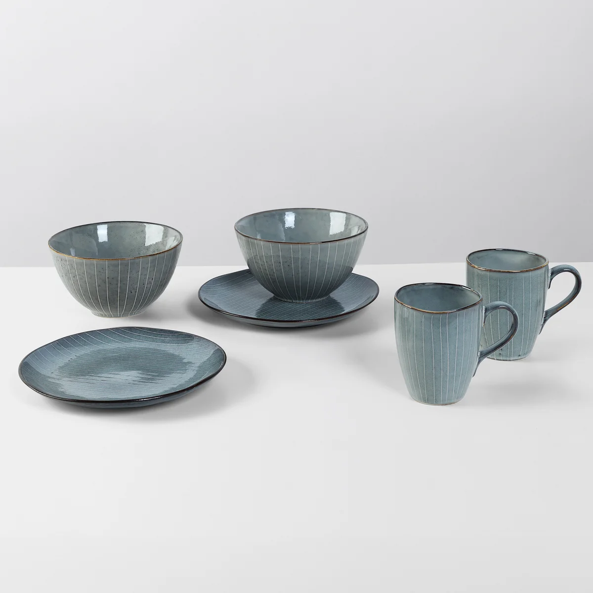La collection Nordic Sea set de vaisselle de Broste Copenhagen s'inspire des couleurs et des structures rugueuses de la côte nordique. Fabriqué en faïence de haute qualité et affiné avec un émail réactif, chaque pièce reçoit une veinure et une nuance de couleur individuelles - des doux tons de gris au bleu profond.