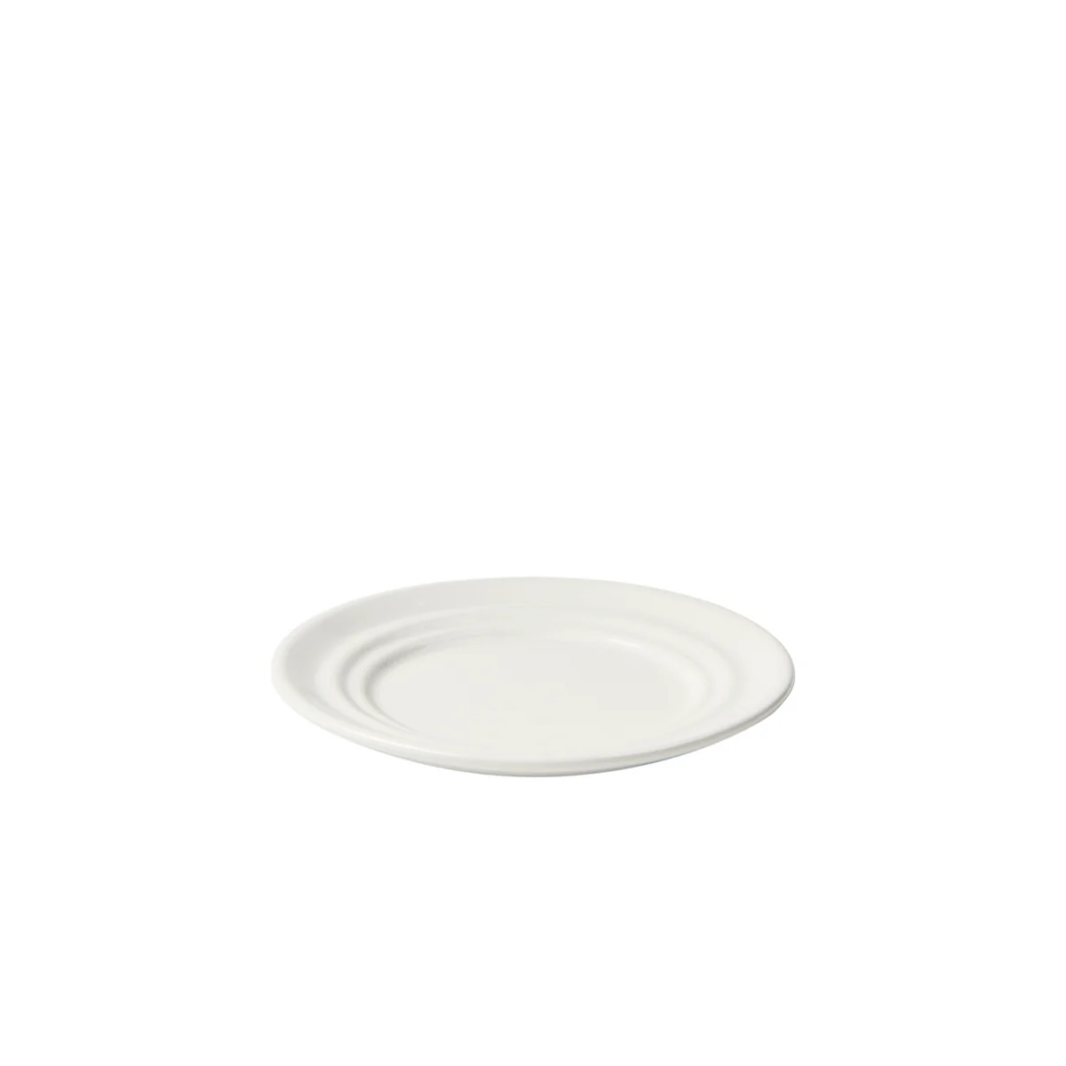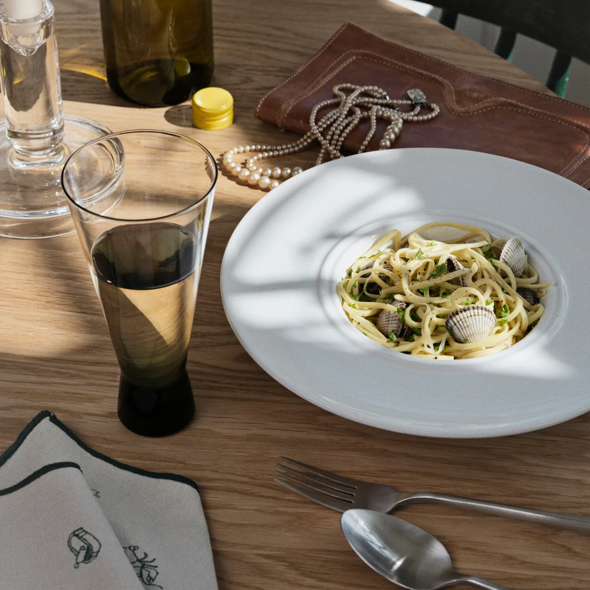La collection, fabriquée en faïence blanche et recouverte d'un émail "Chalk White", confère à la table une note accueillante. La céramiste danoise Julie Bonde a conçu cette série dont les deux anneaux marquants encadrent artistiquement les assiettes.