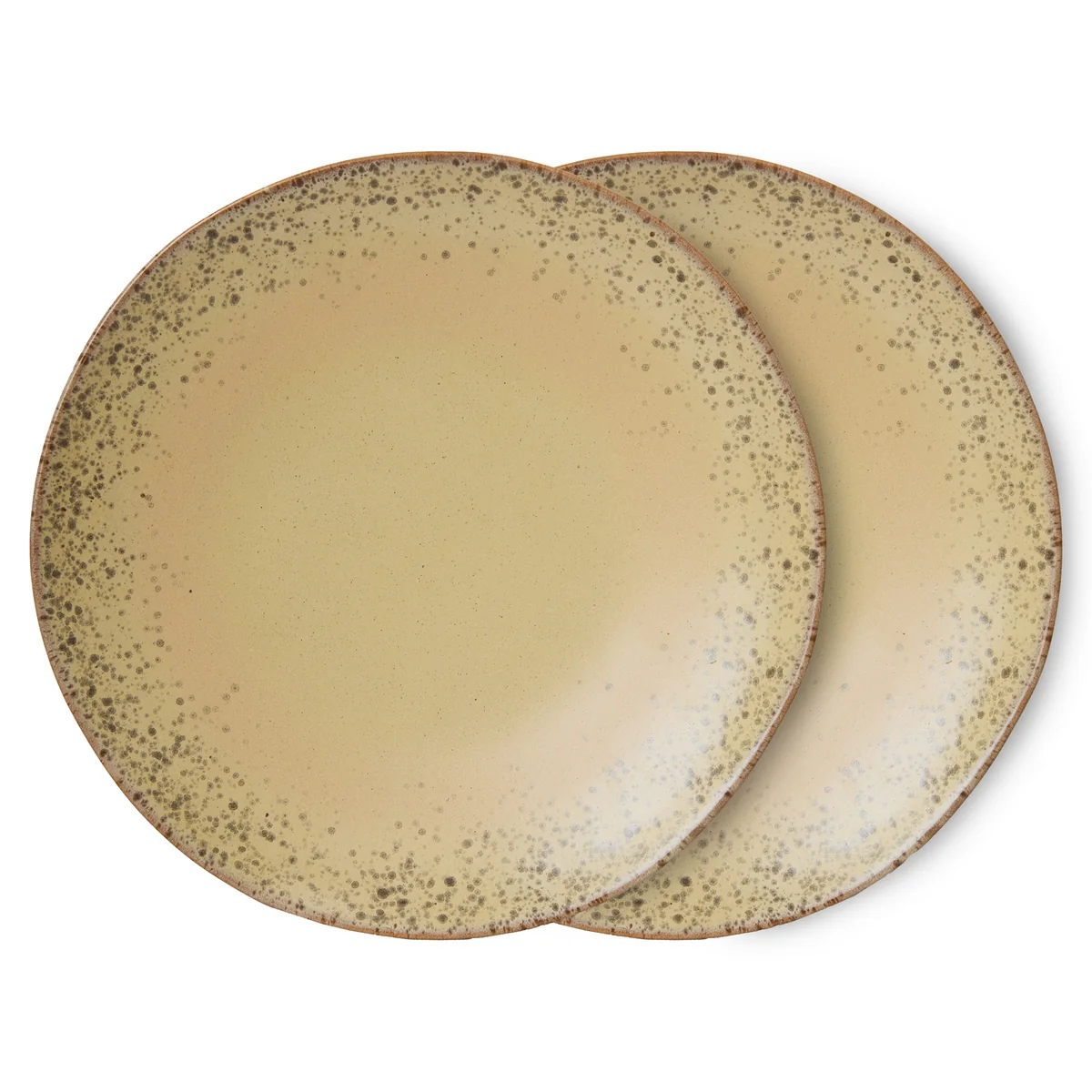 Les assiettes sont fabriquées en céramique. Fabriquée à la main, chaque assiette est absolument unique. Outre les assiettes, la série comprend des bols, des gobelets, des tasses et des pichets. 70's série de HKliving .