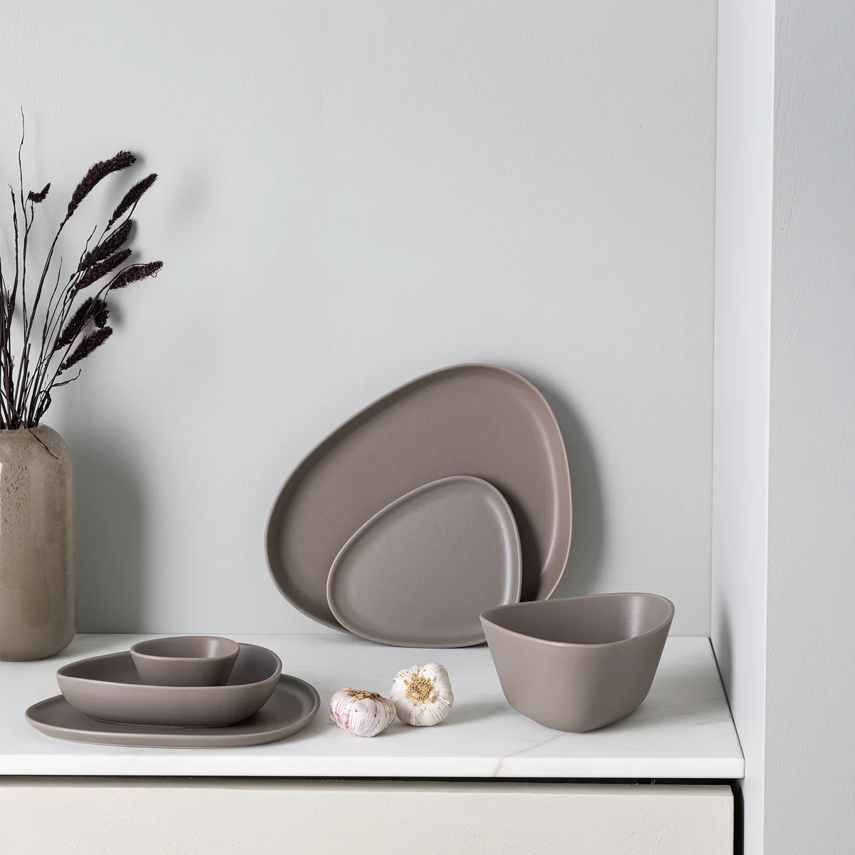 Les assiettes sont disponibles en différentes tailles, ce qui permet de les utiliser pour tout type d'aliments. L'assiette profonde convient aux soupes, les assiettes peu profondes aux petits-déjeuners, déjeuners et dîners et le plateau est optimal pour le service et la présentation. Les assiettes sont fabriquées en grès robuste, ce qui les rend faciles à nettoyer au lave-vaisselle.