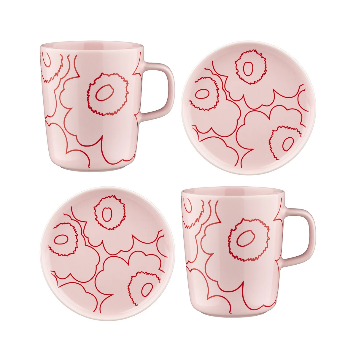 Le set de vaisselle Piirto Unikko Oiva comprend deux tasses (2,5 dl) et deux assiettes (13,5 cm), fabriquées en céramique de haute qualité avec un glaçage rose. Le set est pratique et polyvalent, car il peut être mis au lave-vaisselle, au four, au micro-ondes et au congélateur. Il est emballé dans une élégante boîte cadeau Marimekko , idéale pour un cadeau élégant.